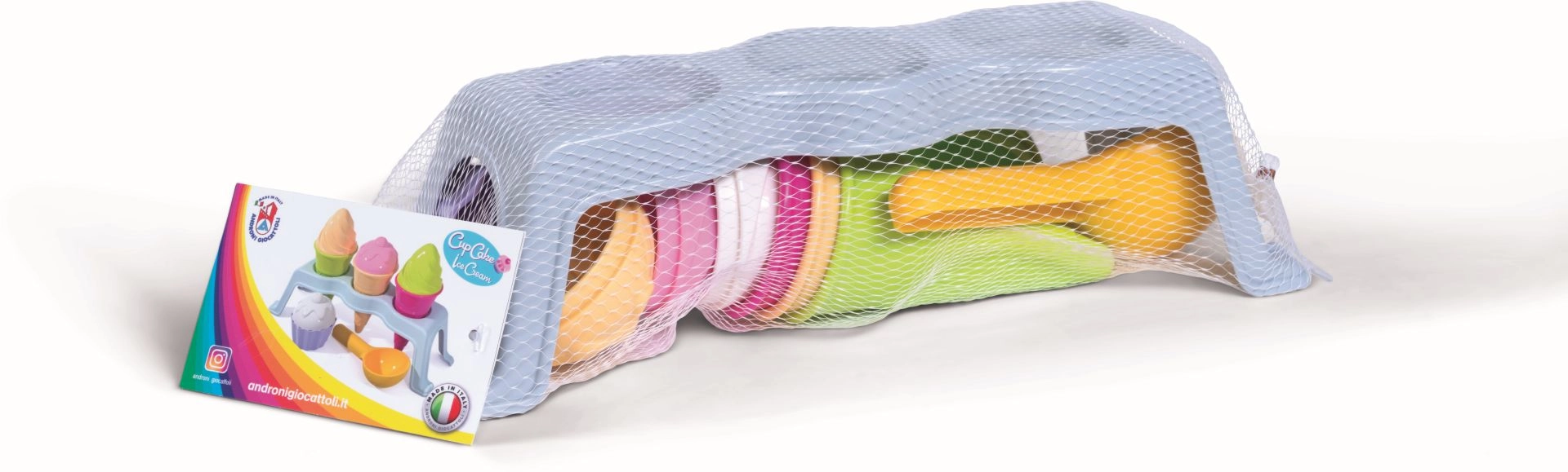 Izklaidējošs 10 daļu smilšu veidņu komplekts saldējuma statīva stilā iepriecinās ikvienu mazu bērnu. Ražots Itālijā no kvalitatīvas plastmasas, piemērots no 10 mēnešu vecuma. Komplektā ir vafeles konusi ar “saldējumu”, kūciņas veidne, saldējuma bumbiņu liekamo karote un praktisks statīvs.