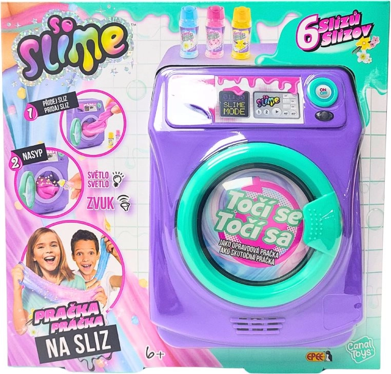 Atklājiet jautru gļotu veidošanu ar rotaļlietu SO SLIME smaržīgo veļasmašīnu violeti–tirkīza krāsā. Bērni no 6 gadu vecuma izbaudīs gaismas un skaņas efektus, griežamu bungas cilindru un caurspīdīgas durtiņas, lai vērotu maisīšanu. Iepakojumā atradīsiet 6 gļotu paciņas, grozu, pudeli un 3 smaržīgas pērlītes burvīgi smaržīgām, krāsainām gļotām. Barošana ar 3× AA baterijām (nav iekļautas).