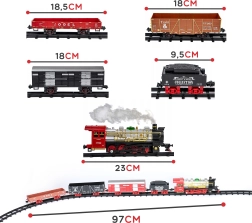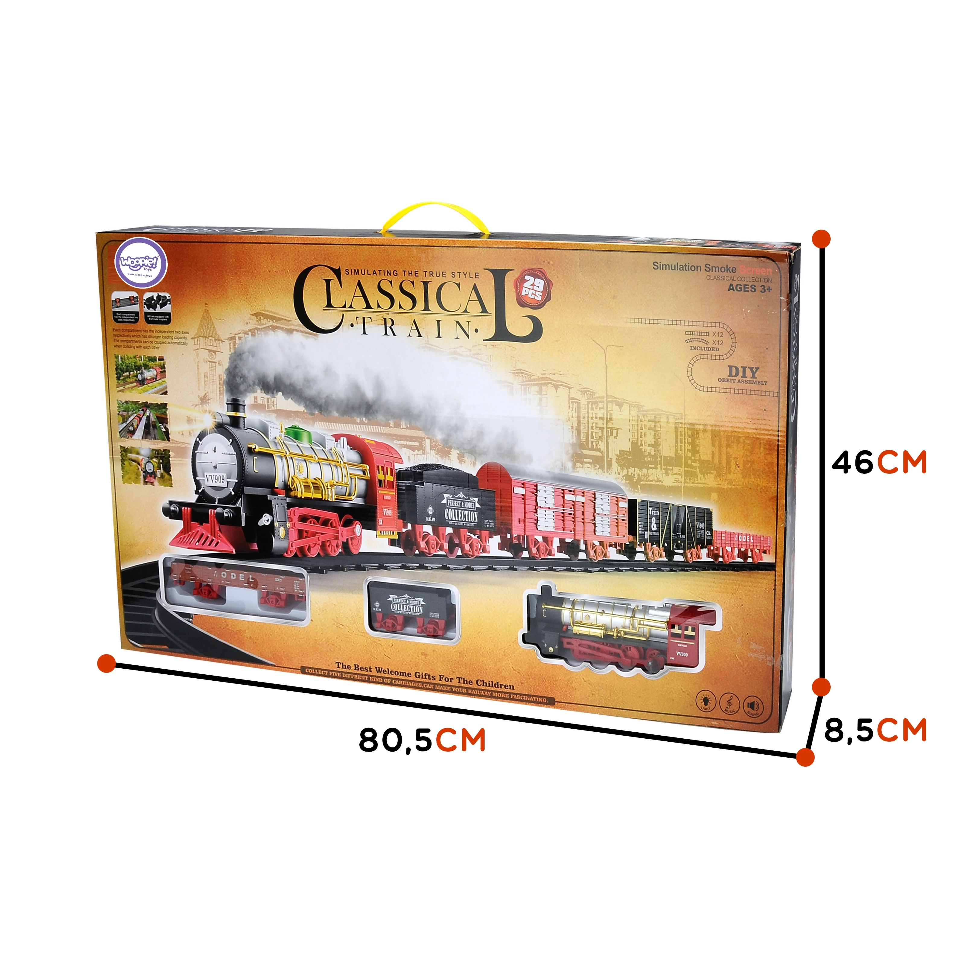 Komplektā ir 29 elementi: lokomotīve, ogļu vagons un vagoni, ar kuriem bērni var uzbūvēt savu apli ar izmēriem 170 × 82 cm. Kopējais sastāva garums ir ap 94 cm, sliežu trases garums 460 cm. Ideāla dāvana, kas veicina iztēles attīstību un praktiskās iemaņas.