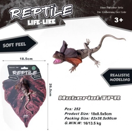 Reālistiska gumijas ķirzaka, iedvesmota no frillneklainās agamas, iepriecinās gan bērnus, gan kolekcionārus. Piedāvā mīkstu un lokanu materiālu, precīzas detaļas un praktisku 18 cm izmēru rotaļām un dekoram.