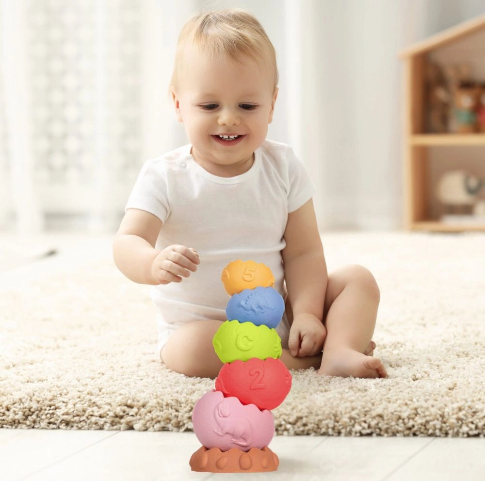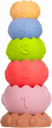 Pasteļtoņu detaļas ir viegli satveramas un stabili kārtojas augstā tornī. Bērni trenē rokas–acs koordināciju un pacietību, veidojot piramīdu atkal un atkal.