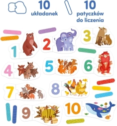 Spēle ar puzlēm veicina vārdu krājuma, iztēles un vizuālās uztveres attīstību. Bērni var nosaukt dzīvniekus, izdomāt stāstus un meklēt skaitļus apkārtējā vidē. Komplekts ir lielisks sākums skaitīšanai līdz 10 un pirmajiem mēģinājumiem rakstīt ciparus.