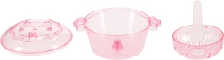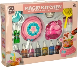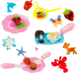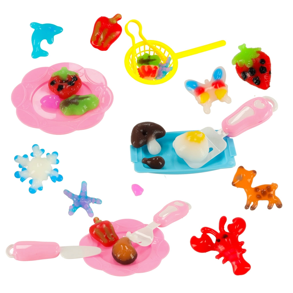 Komplekta saturs: Komplektā ir 12 gēla pudelītes dažādās krāsās, 24 formiņas, kausiņš ar kalcija laktātu, 4 šķīvji, 4 paplātes, 2 sietiņi, 2 knaģīši, 1 krūzīte ar vāciņu interaktīvām spēlēm un citi piederumi.