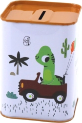 Jautras ilustrācijas ar dinozauru mašīnā un košas krāsas padara krājkasi arī par skaistu dekoru.