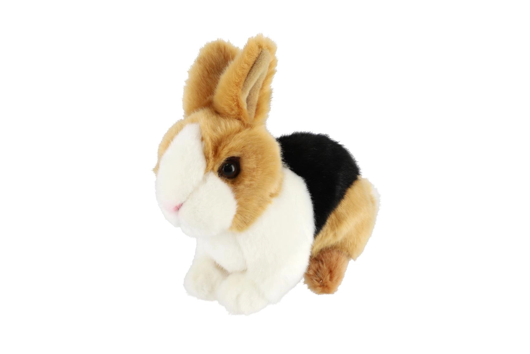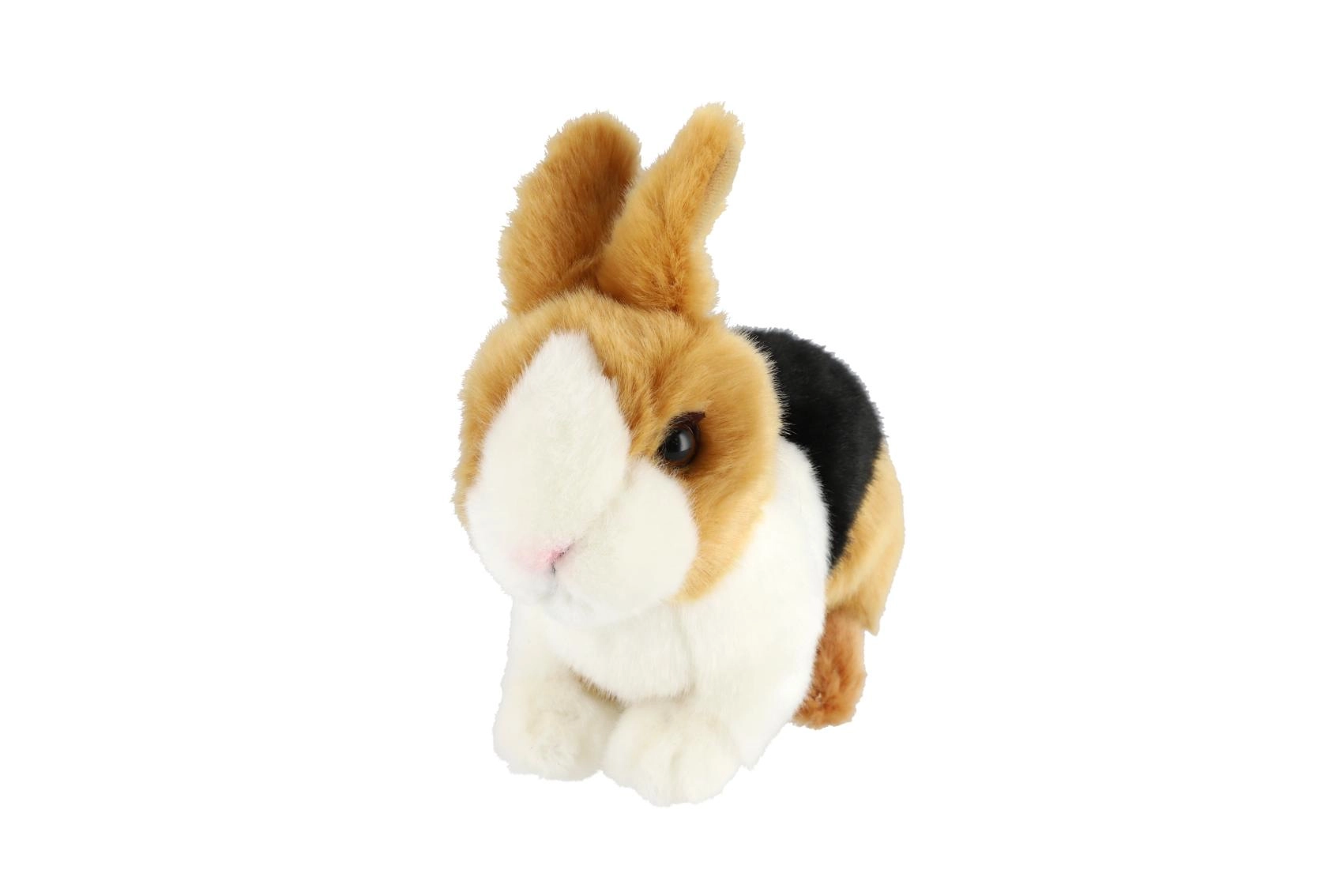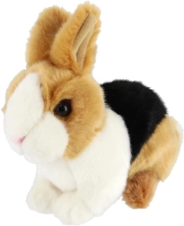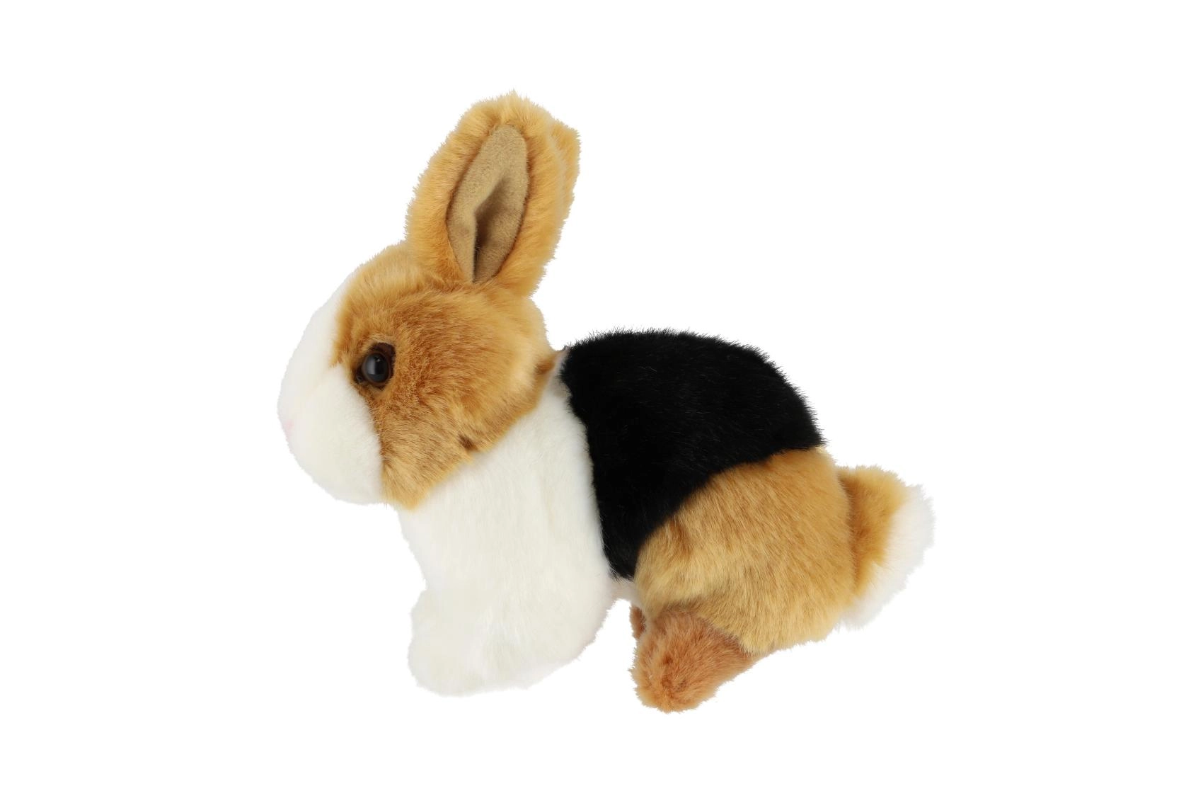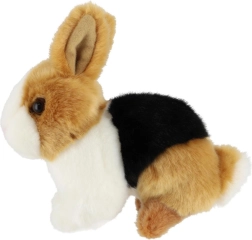 Brūnās, melnās un baltās krāsas kombinācija un autentiskās ausu un acu detaļas piešķir trusītim dzīvīgu izskatu.