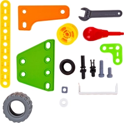 - 164 detaļas, tostarp riteņi, skrūves, uzgriežņi un instrumenti