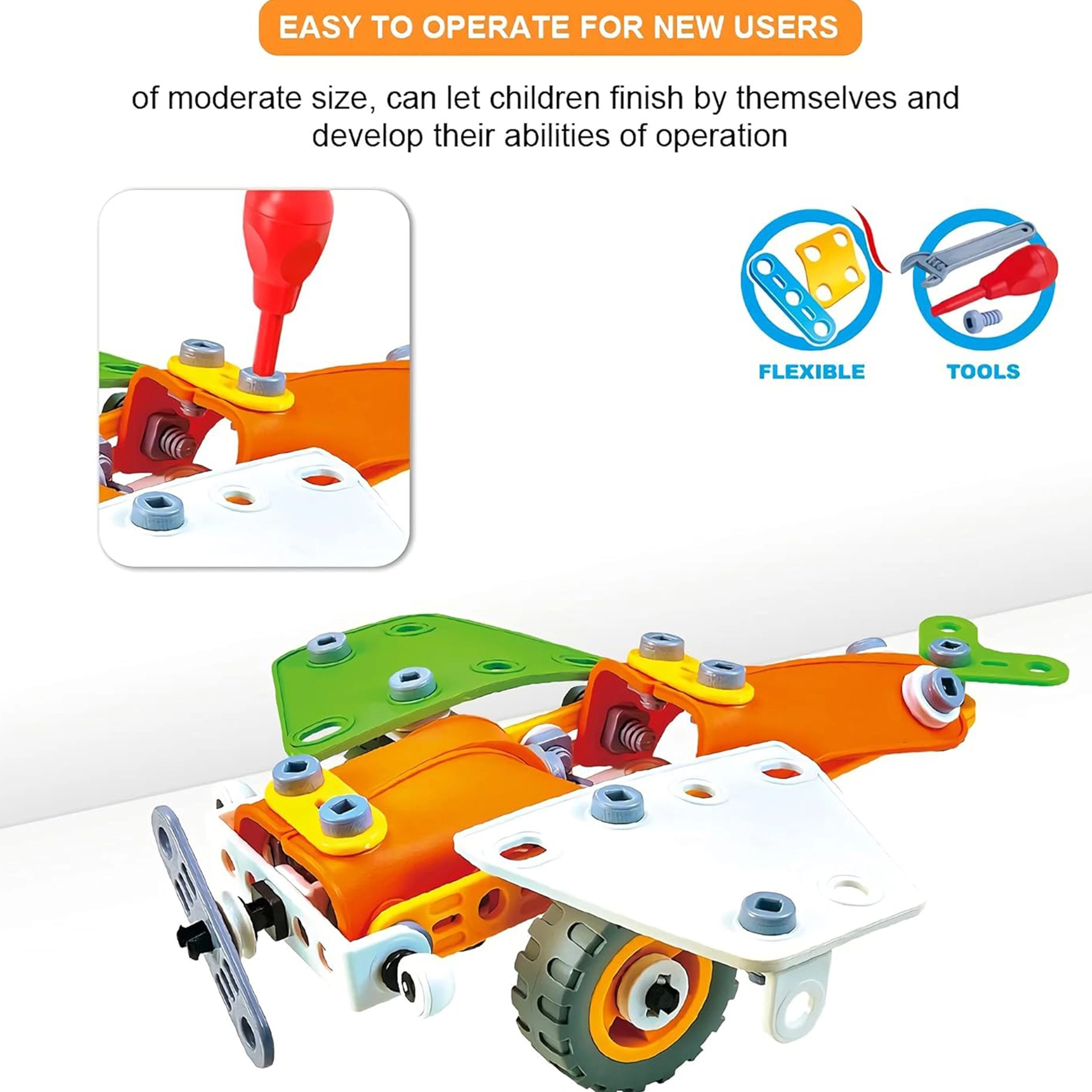 Riteņi, skrūves un šarnīri ļauj veidot modeļus ar funkcionāliem un kustīgiem elementiem vēl jautrākai spēlei.