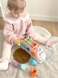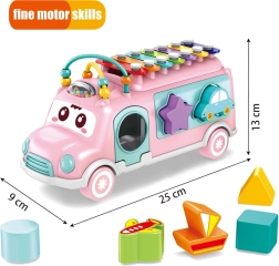 Mīlīgais rozā WOOPIE BABY mūzikas autobuss apvieno ksilofonu, formu šķirotāju un citus elementus jautrai spēlei un mācībām. Tas attīsta bērnu sīko motoriku, loģisko domāšanu un koordinācijas prasmes ar krāsainām taustiņplatēm, klucīšiem un bīdāmiem krellīšu elementiem. Ideāls izmērs mazām rociņām un patīkamas pasteļkrāsas aicina spēlēties katru dienu.