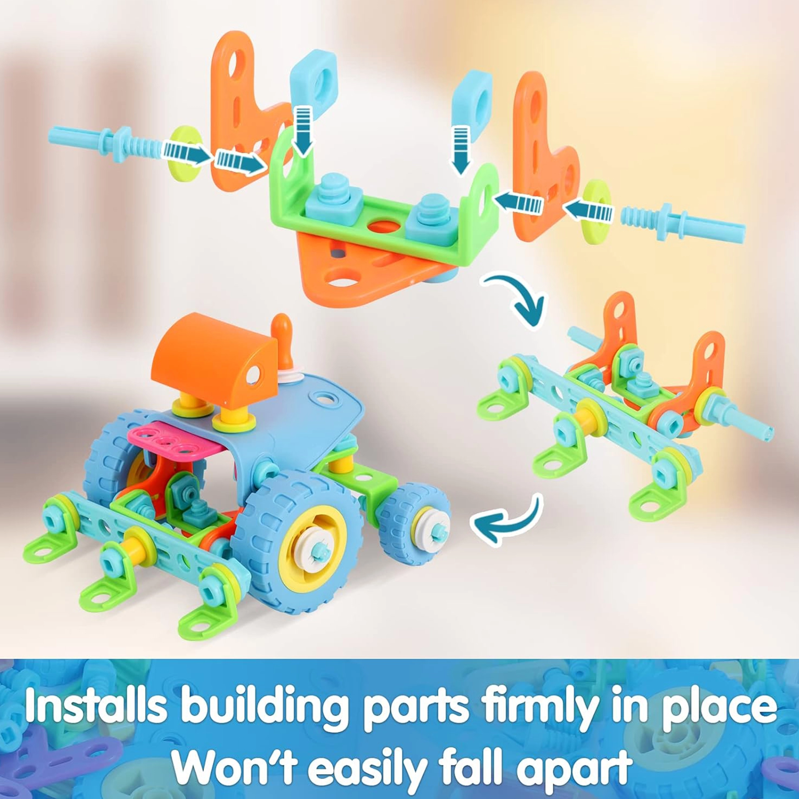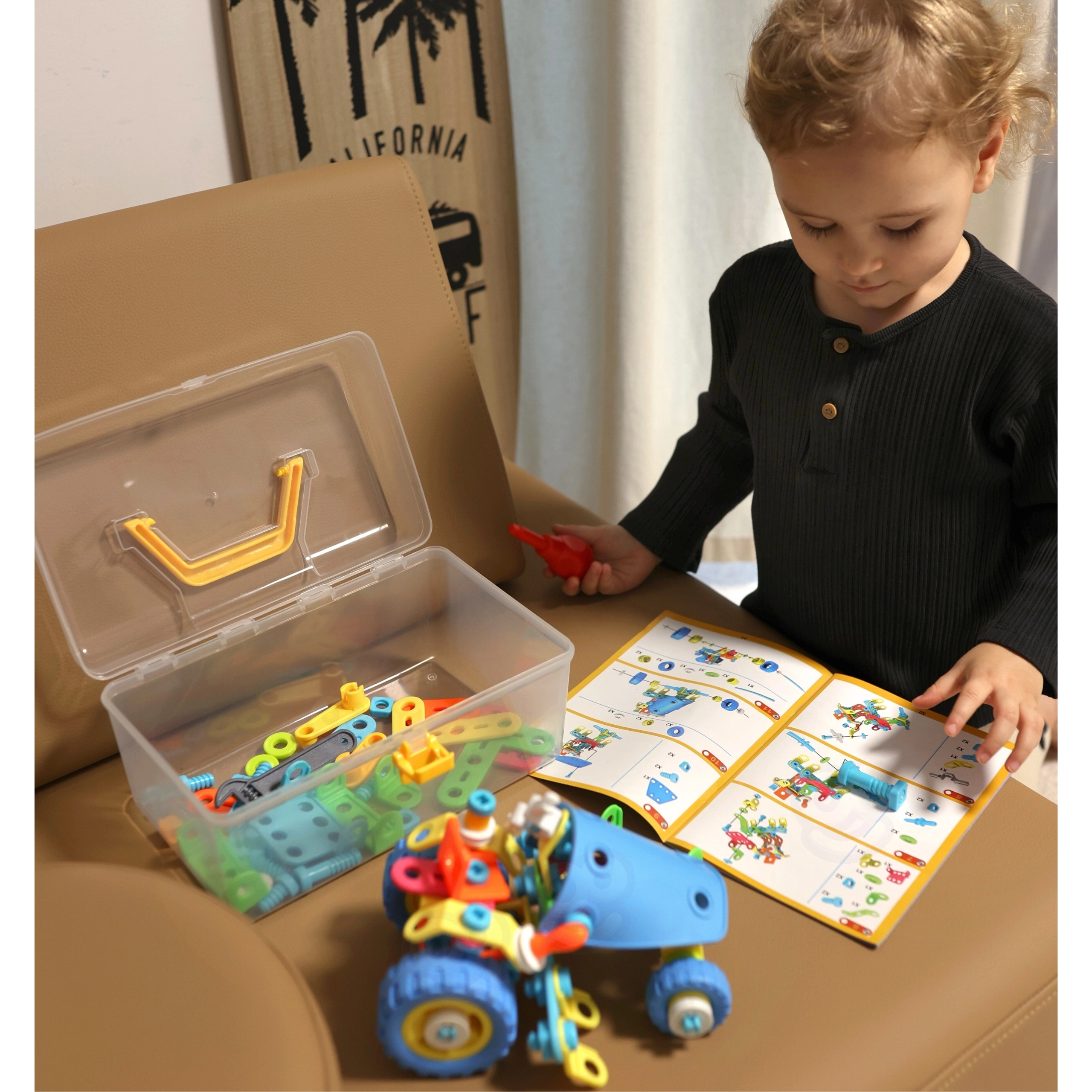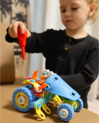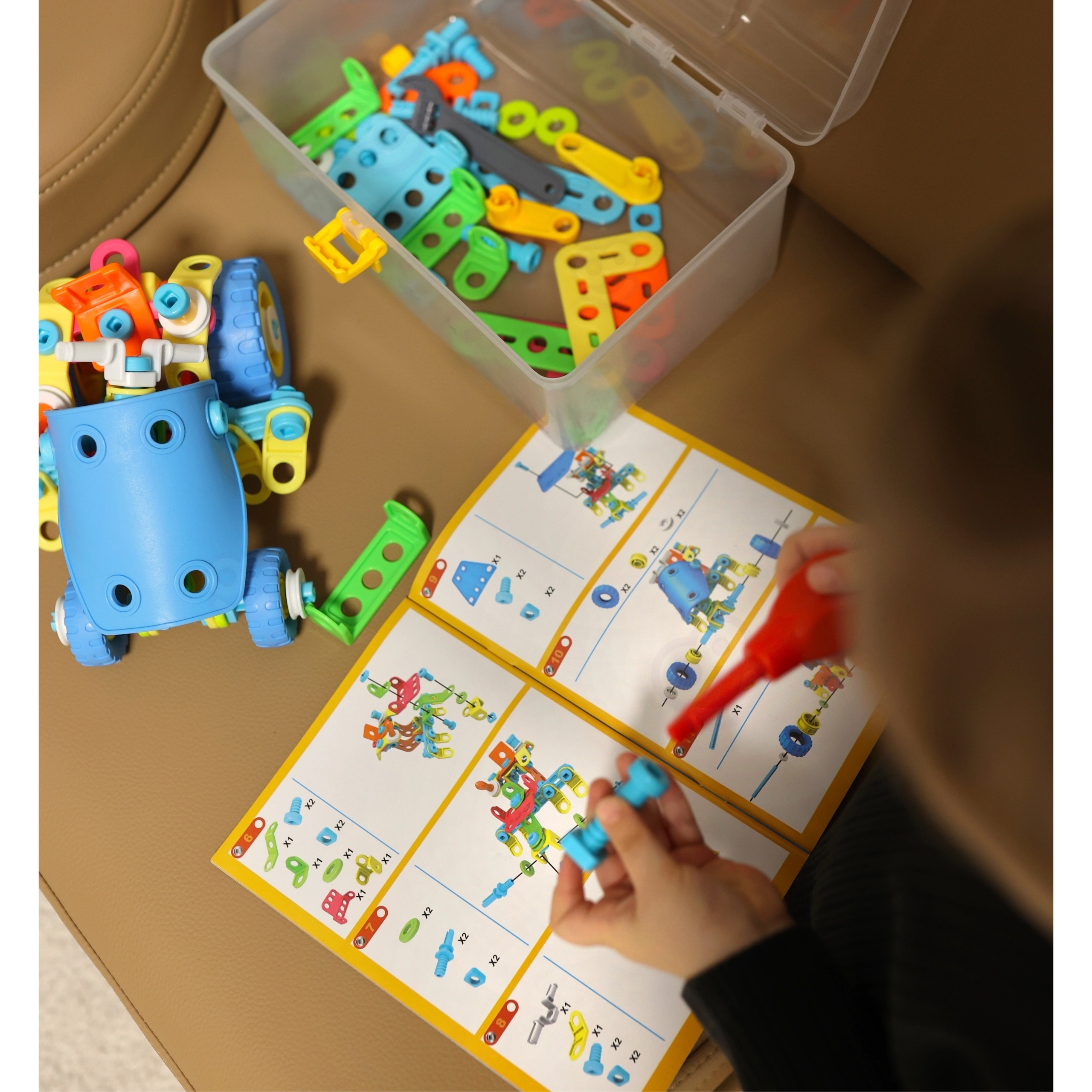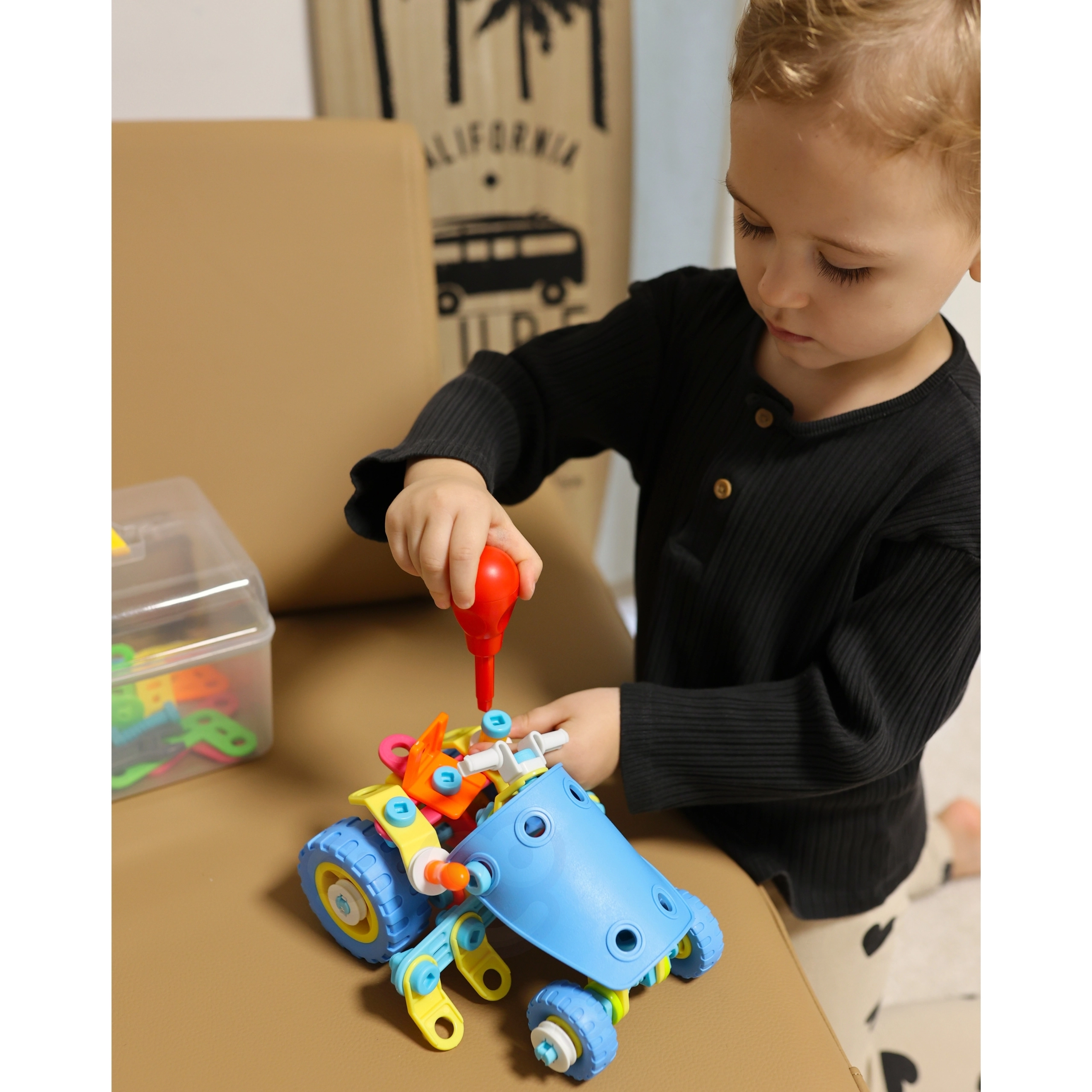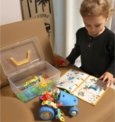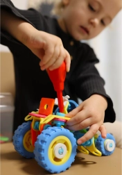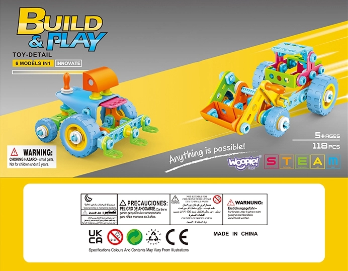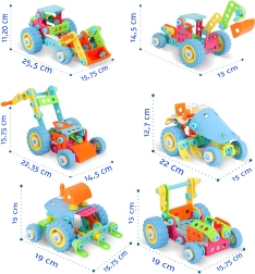 Konstruktors WOOPIE 6in1 STEM ir ideāla izvēle mazajiem inženieriem no 5 gadu vecuma. Elastīgās detaļas, riteņi un kustīgās daļas ļauj bērniem salikt dažādus funkcionējošus transportlīdzekļu modeļus – no iekrāvēja līdz traktoram ar arklu. Praktiskais skrūvgriezis un atslēga komplektā veicina roku veiklību un koordināciju.