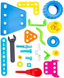 - 118 detaļas: dažādu formu būvelementi, riteņi, skrūves un uzgriežņi, skrūvgriezis un plakanā atslēga