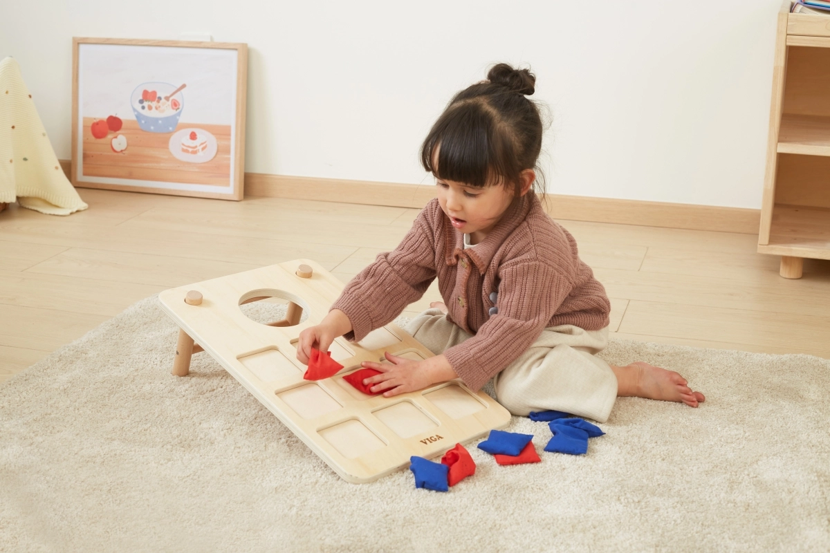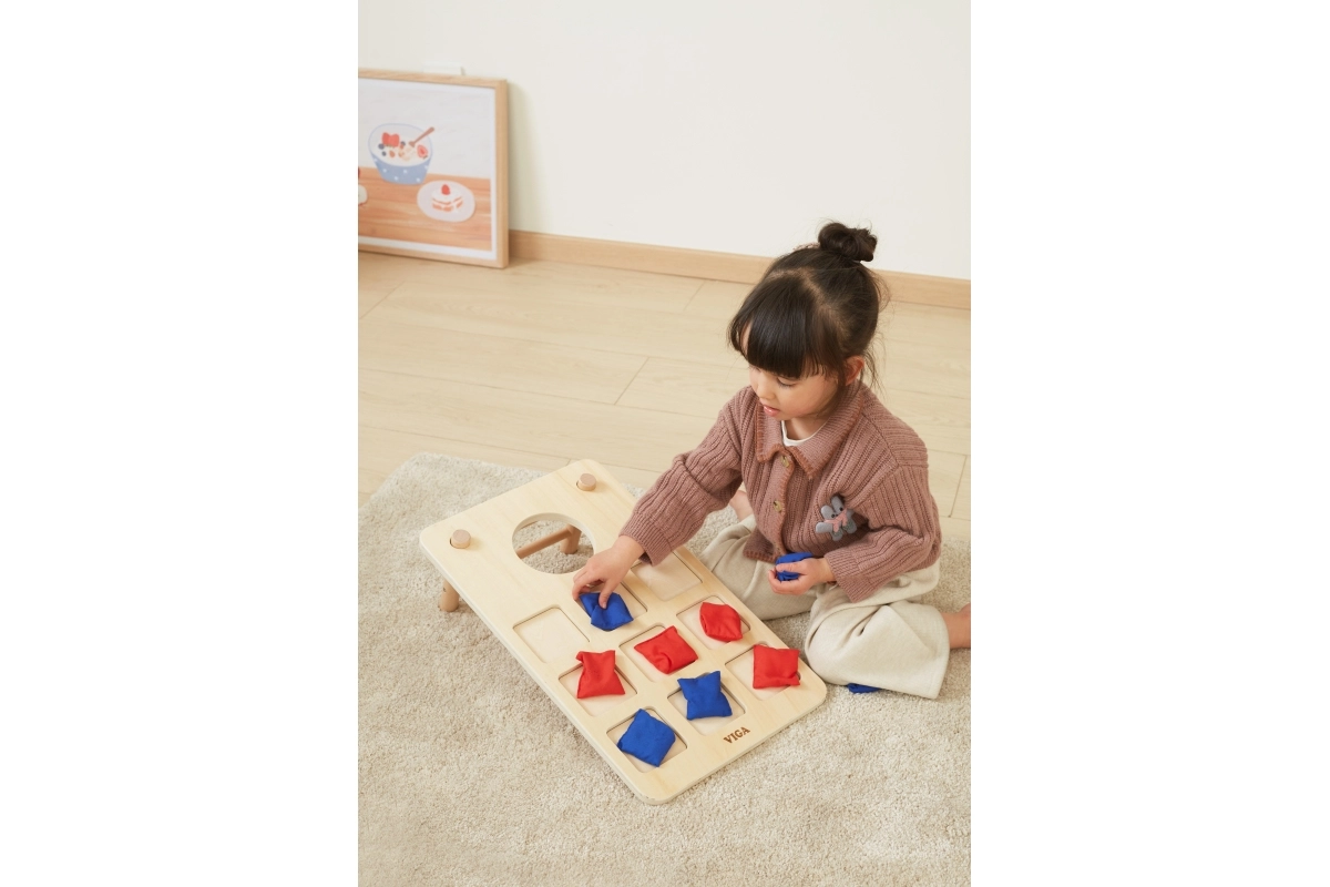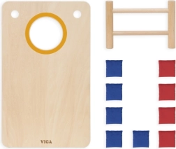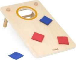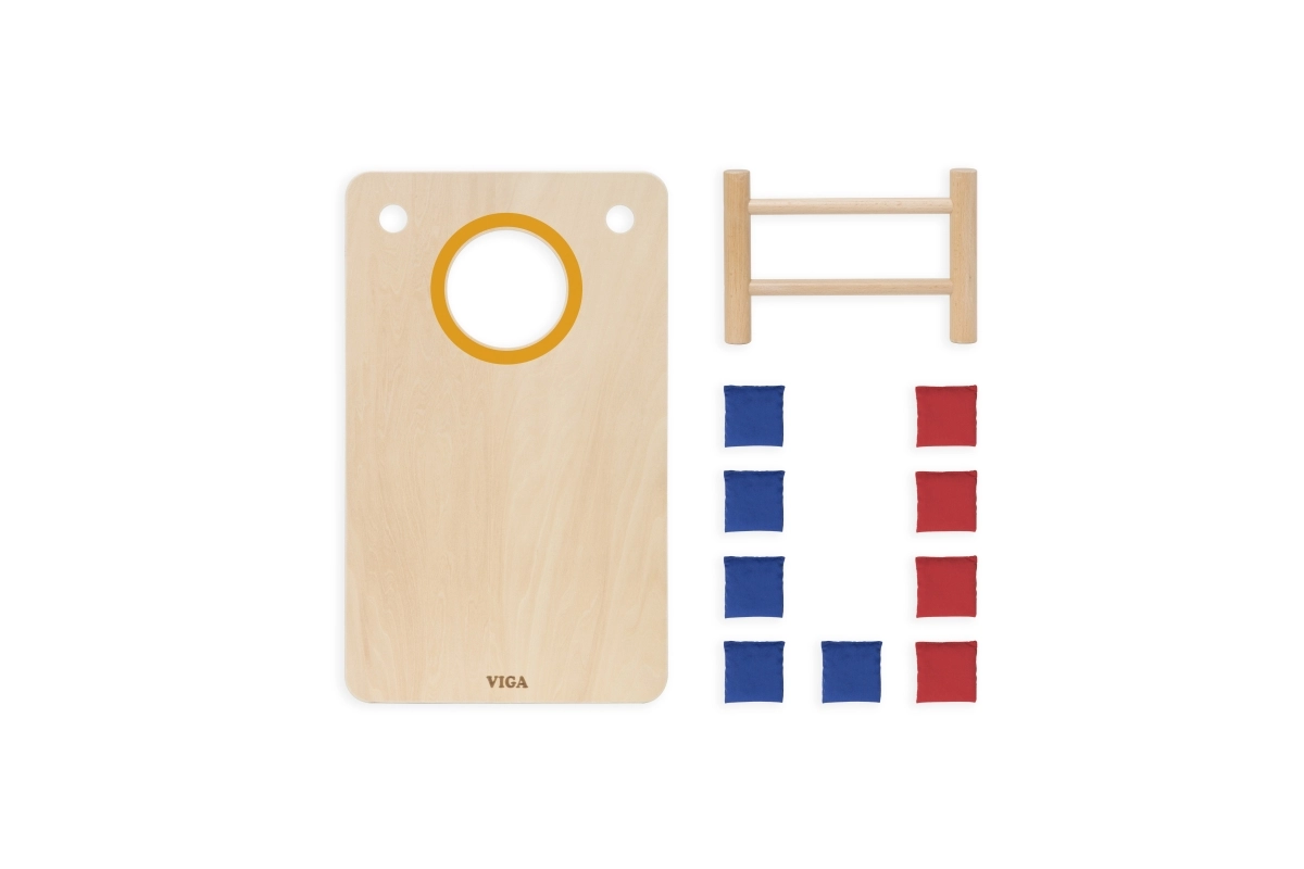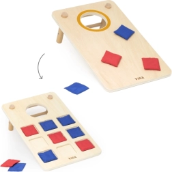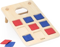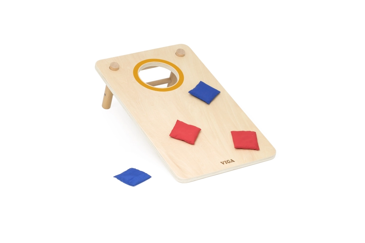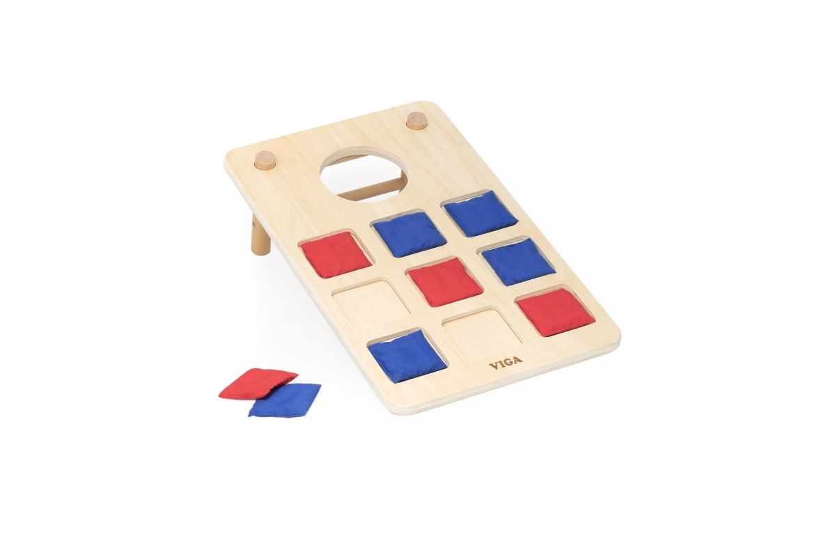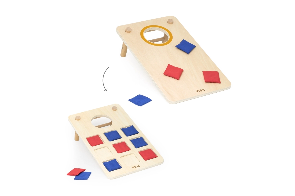 Izklaidējoša koka 2-in-1 mešanas spēle no VIGA apvieno klasisko cornhole un krustiņus–nullītes. Pateicoties izturīgajai koka konstrukcijai, slīpām kājiņām un auduma maisiņiem sarkanā un zilā krāsā, tā piedāvā ģimenes izklaidi, attīsta roku–acu koordināciju, trenē metiena precizitāti un veicina strateģisko domāšanu krustiņu–nullīšu spēlē.