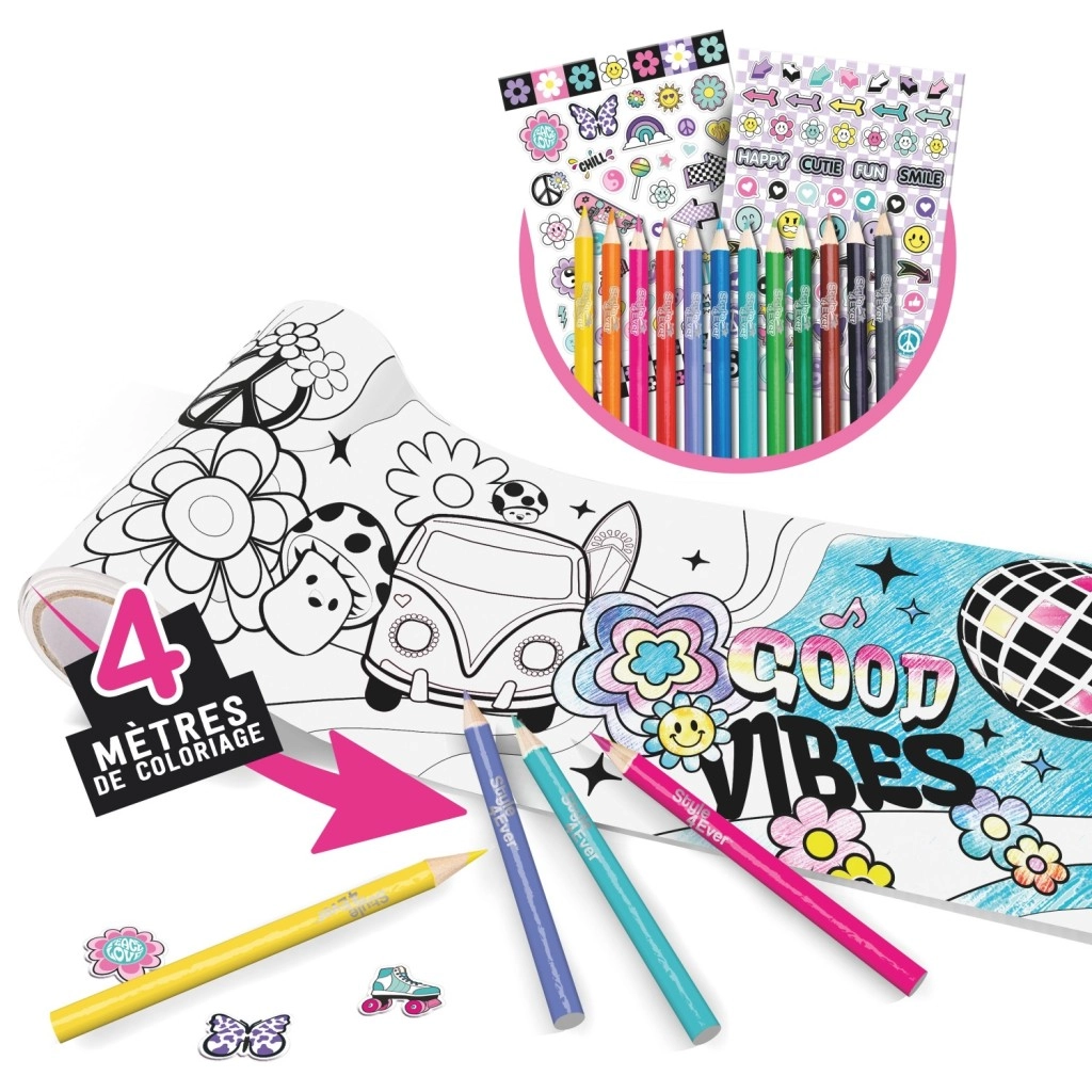 Komplektā ietilpst 12 kvalitatīvi zīmuļi košās krāsās un vairāk nekā 50 krāsainas uzlīmes, kas ļauj attēlus dekorēt un personalizēt. Krāsojamais rullis ir piemērots bērniem no 6 gadu vecuma un dabiski veicina koncentrēšanos, pacietību un sīkās motorikas attīstību.