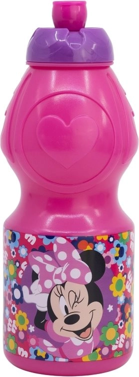 Rozā plastmasas pudele ar violetu vāciņu un Minnie Mouse motīvu sniedz ne tikai praktisku, bet arī estētisku vērtību bērniem.