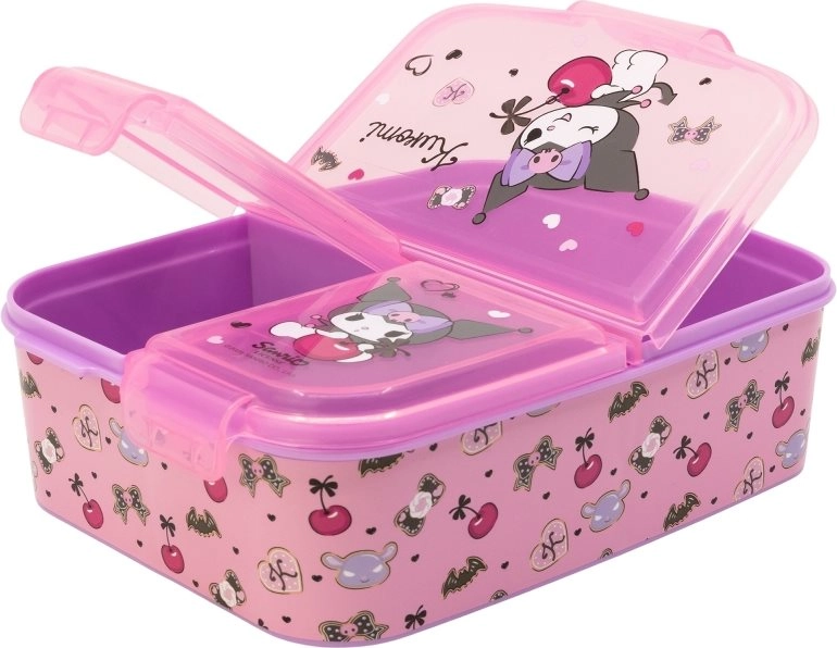 Vairs nekādu sajauktu uzkodu. STOR multi box ar licencēto KUROMI motīvu ir ar vienu lielu un diviem mazākiem nodalījumiem, tāpēc viegli atdalīsiet augļus un dārzeņus no sviestmaizes vai saldajām uzkodām. Izturīgā konstrukcija ir piemērota ikdienas lietošanai un iztur arī pa kādam kritienam.