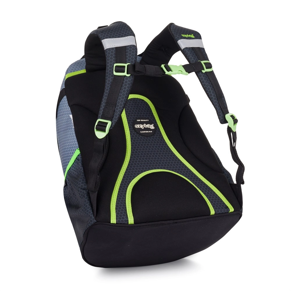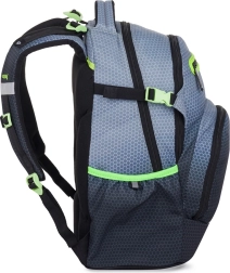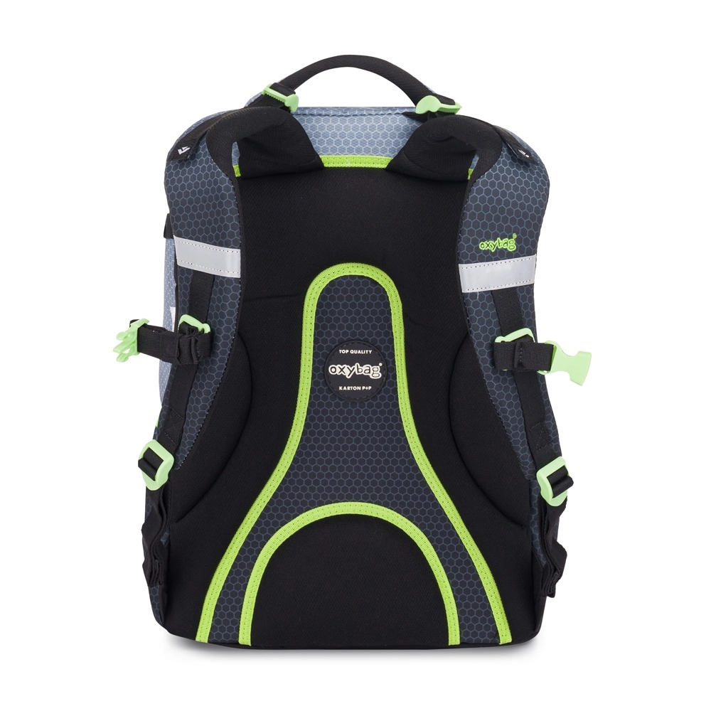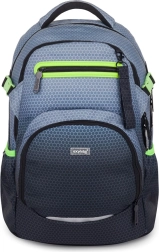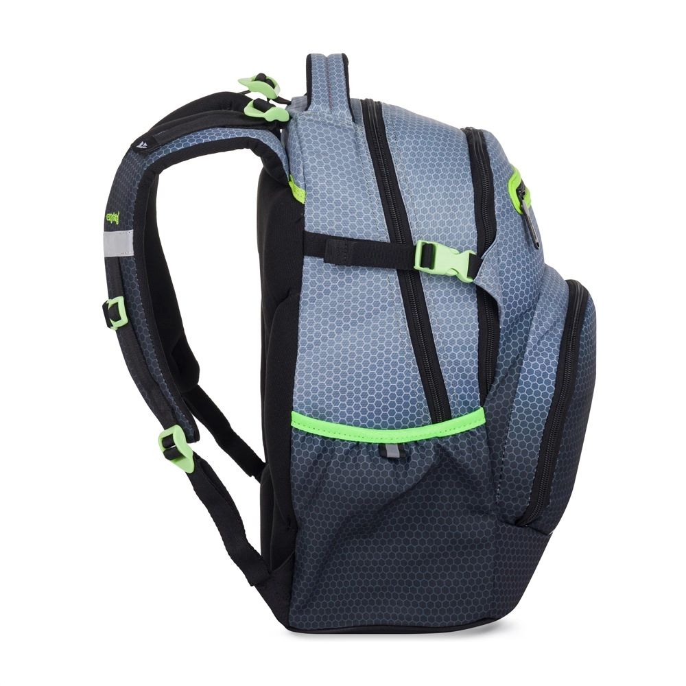 Pārdomātais iekšējais dalījums piedāvā divas ietilpīgas kameras mācību grāmatām un burtnīcām, priekšējo kabatu sīkumiem vai nelielai uzkodai un sānu elastīgās kabatas dzēriena pudelei ērtai piekļuvei. Neiztrūkst drošības atstarojošie elementi, kas palielina redzamību krēslā un lietū. Stilīgais ombré izskats ar sešstūra rakstu un zaļām detaļām piešķir mugursomai izteiksmīgu un mūsdienīgu raksturu.