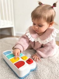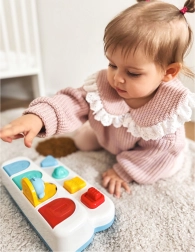 Pogas, ritenītis un slēdzis palīdz trenēt pirkstiņus un acu–roku koordināciju aizraujošā veidā.