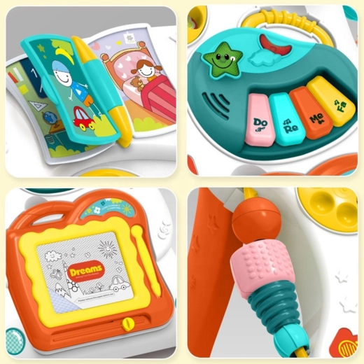 Komplektā ir magnētiskā zīmēšanas tāfele bez nekārtības zīmēšanai, klavierītes ar melodijām, drošs spogulītis, krāsaina grāmatiņa un noņemams telefons, ko var lietot arī kā atsevišķu rotaļlietu. Groziņš un 3 bumbiņas aicina uz turpmākām spēlēm un koordinācijas treniņu.