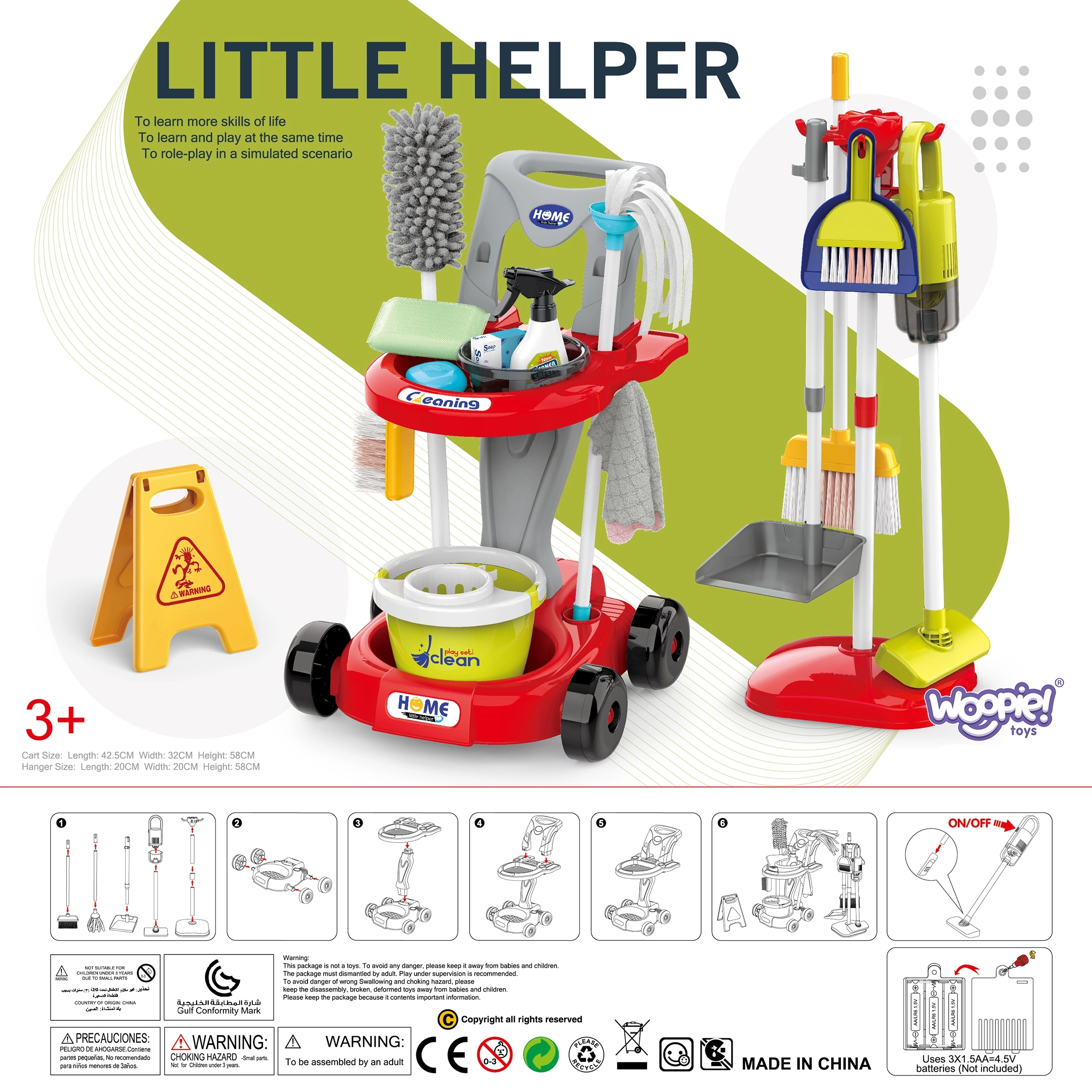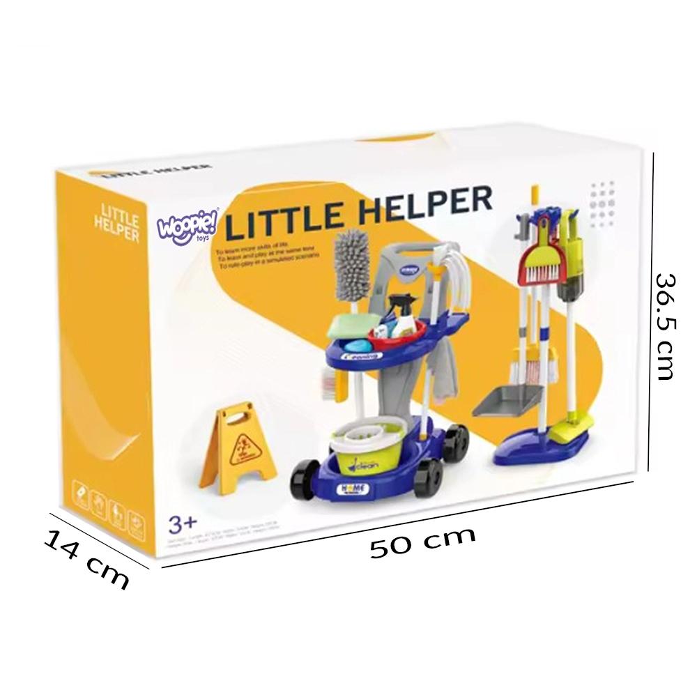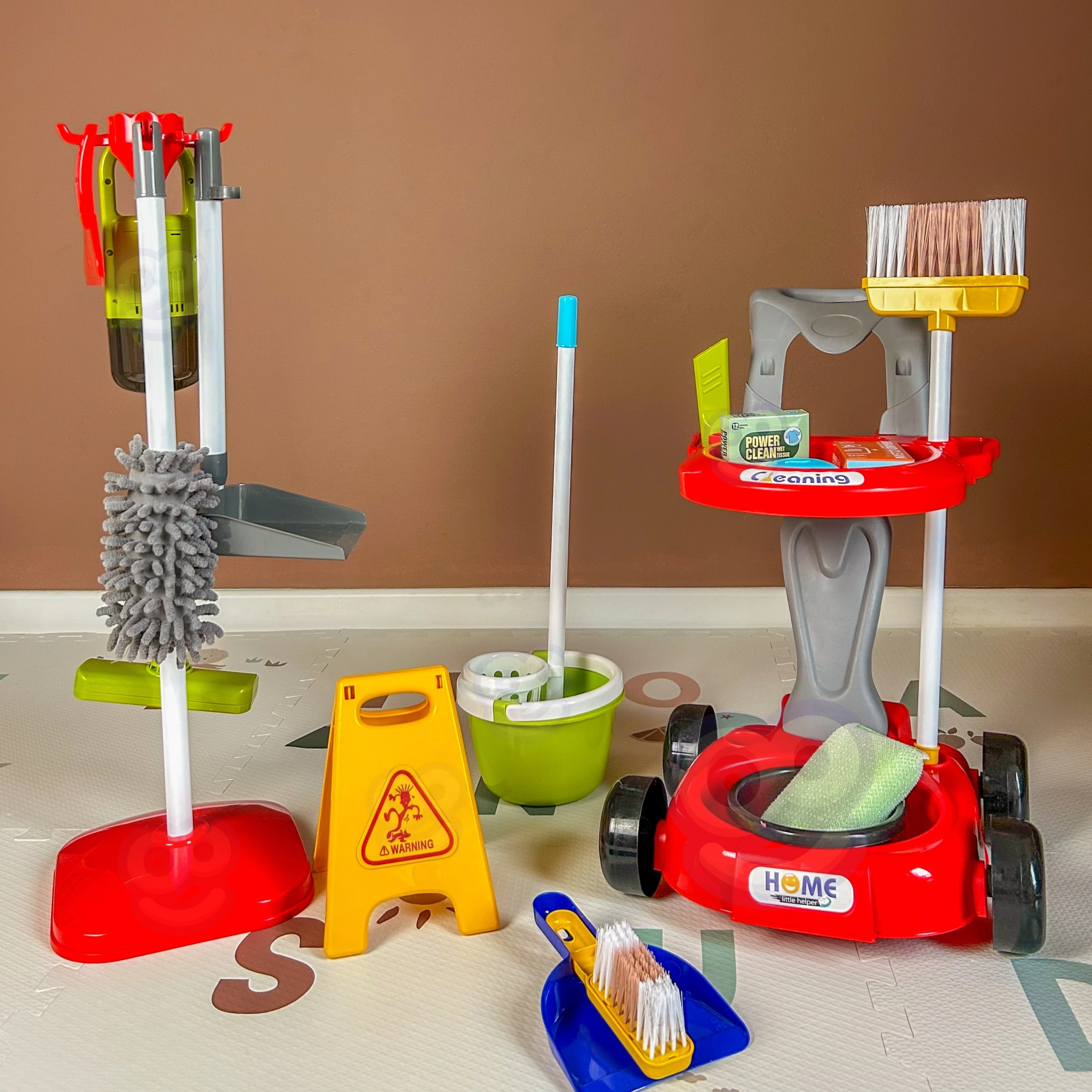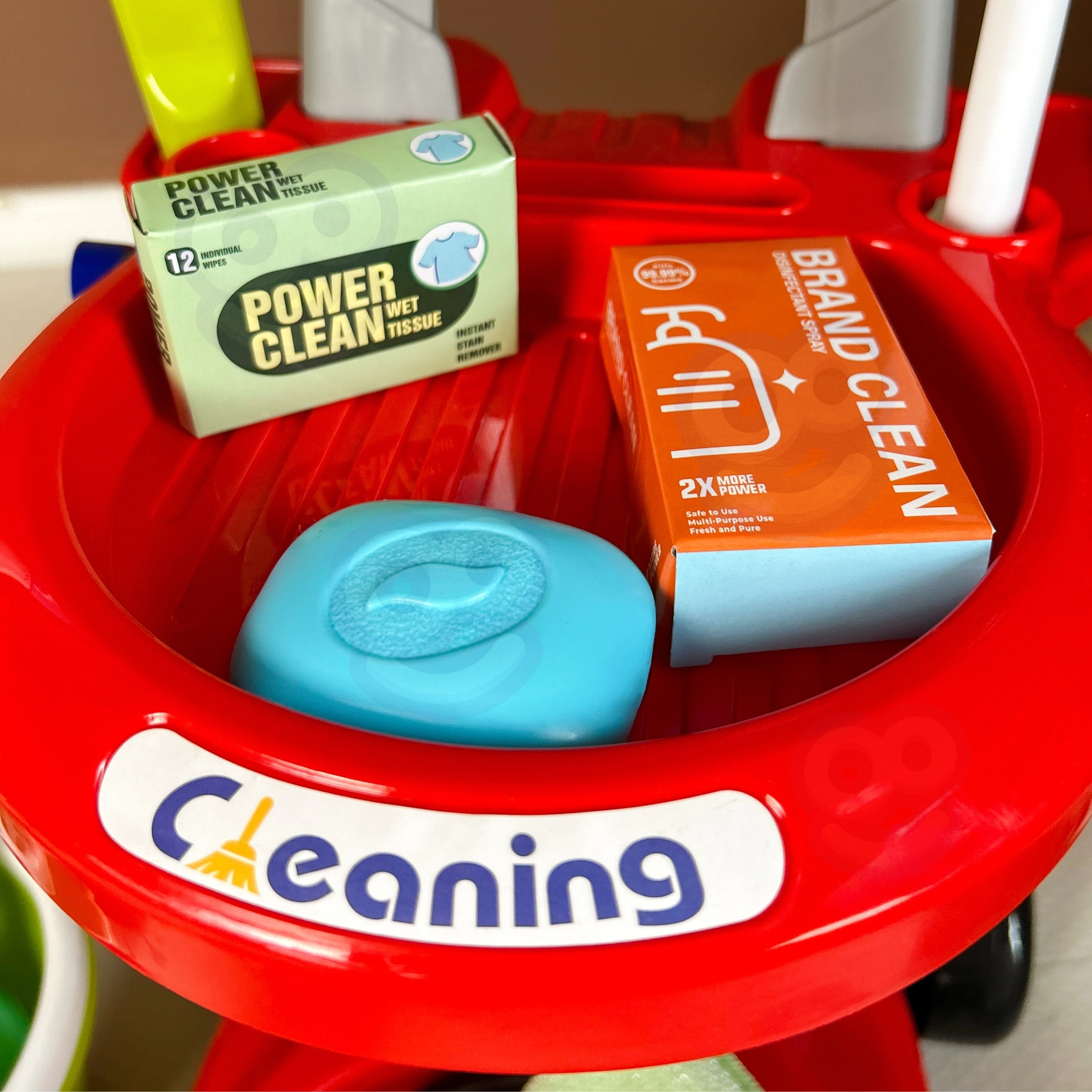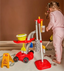 Komplektā ir viss nepieciešamais: rati uz riteņiem, mops, slots un otiņa ar liekšķeri, spainis, smidzinātājs, lupatiņas, brīdinājuma zīme “Uzmanību, slidena grīda” un citi piederumi. Daudzie elementi nodrošina bērniem daudzas stundas jautrības un veicina lomu spēles un sadarbību ar brāļiem un māsām.