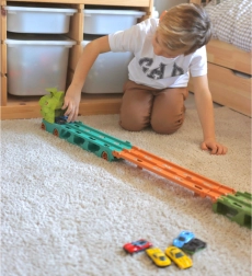 Bērniem patiks garā trase viņu mašīnītēm, kas sniedz daudz vietas aizraujošām sacīkstēm un neierobežotai iztēlei.