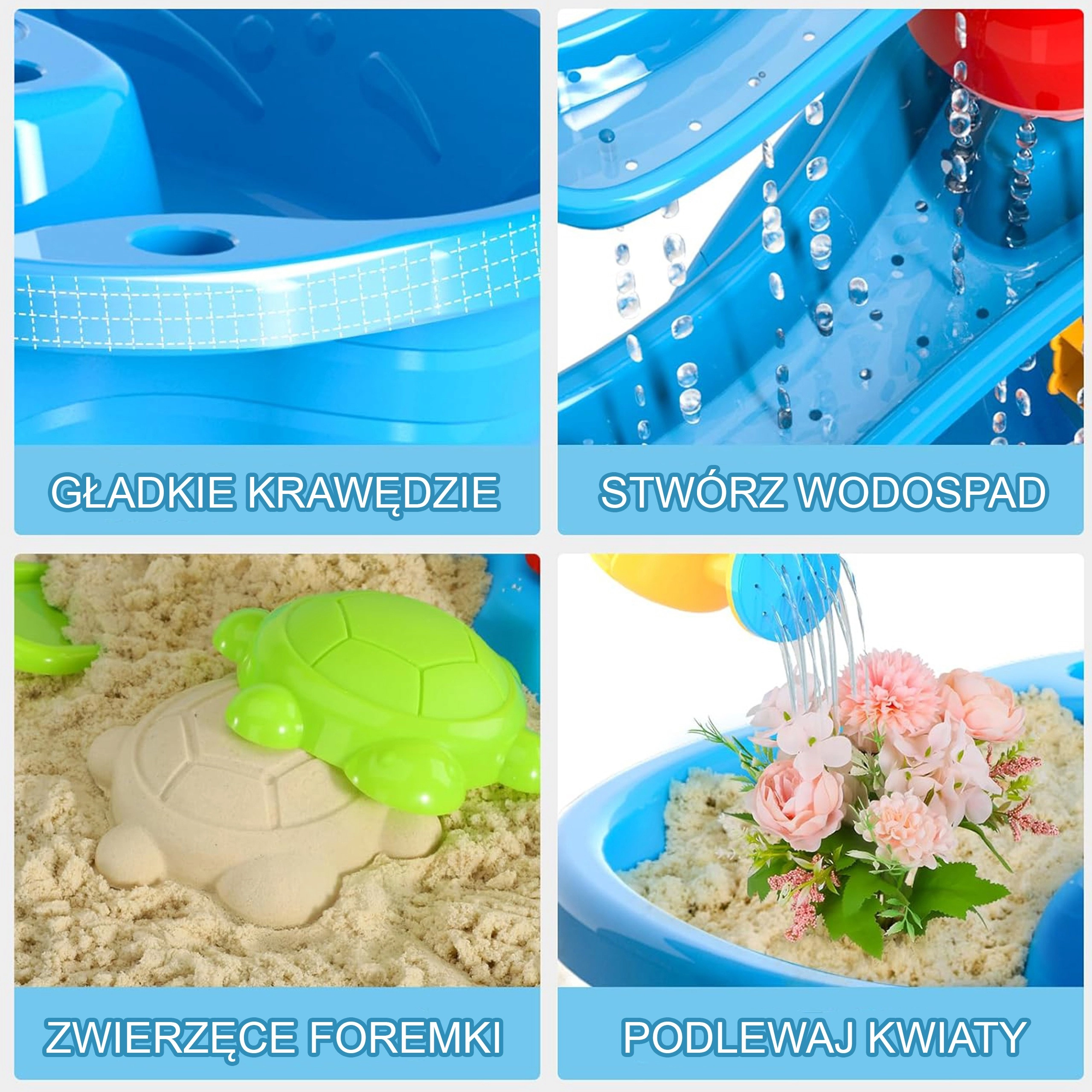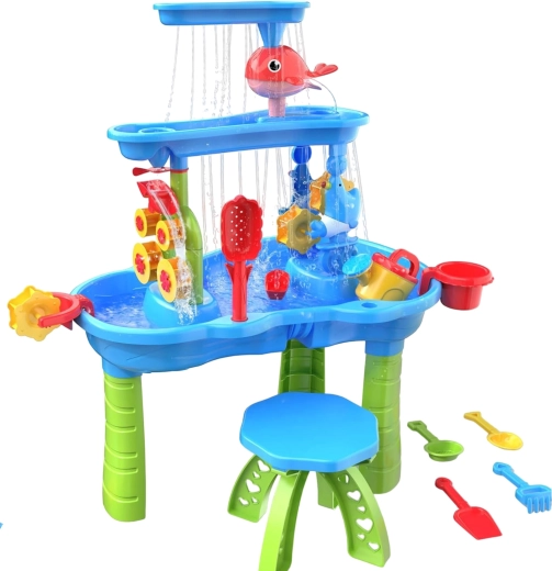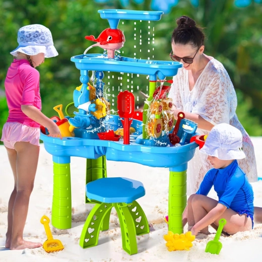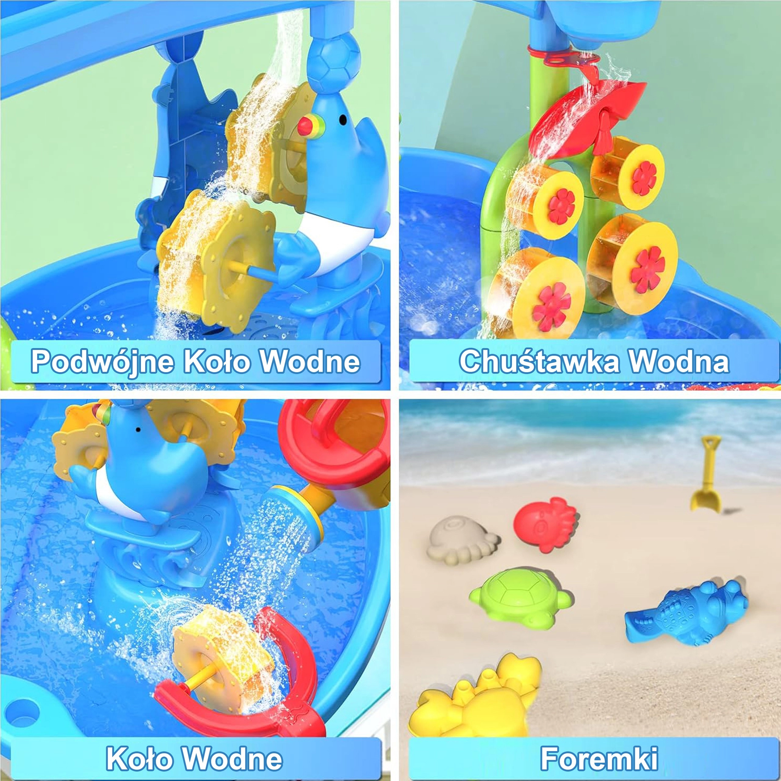WOOPIE XL ūdens un smilšu galds nodrošina bērniem izklaidi visu gadu – vasarā atsvaidzinošas ūdens aktivitātes, vēsākā laikā darbošanās ar smiltīm vai kinētiskajām smiltīm. Pateicoties 3 līmeņu kaskādes sistēmai, bērni lej ūdeni augšējā tvertnē un vēro, kā straume griež ūdens ratus un dzirnaviņas un plūst uz apakšējām vanniņām. Komplektā ietilpst arī krēsliņš un plašs rīku klāsts spēlēm un eksperimentiem.