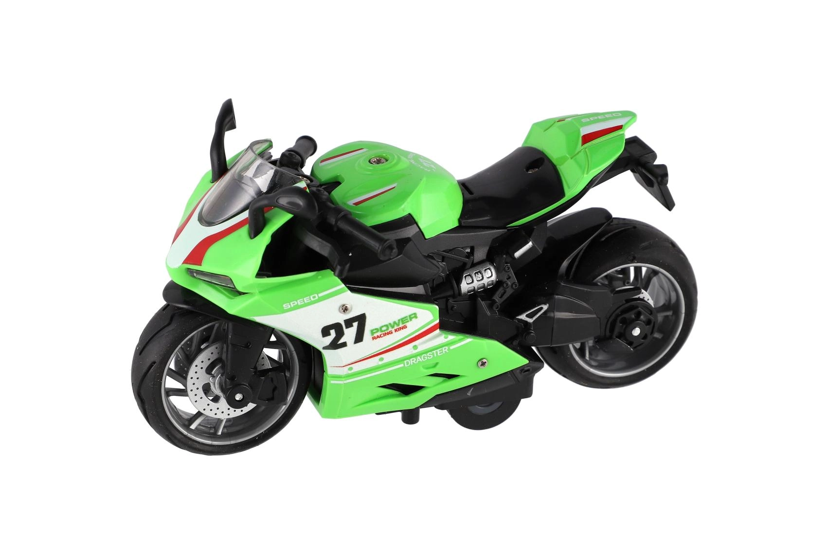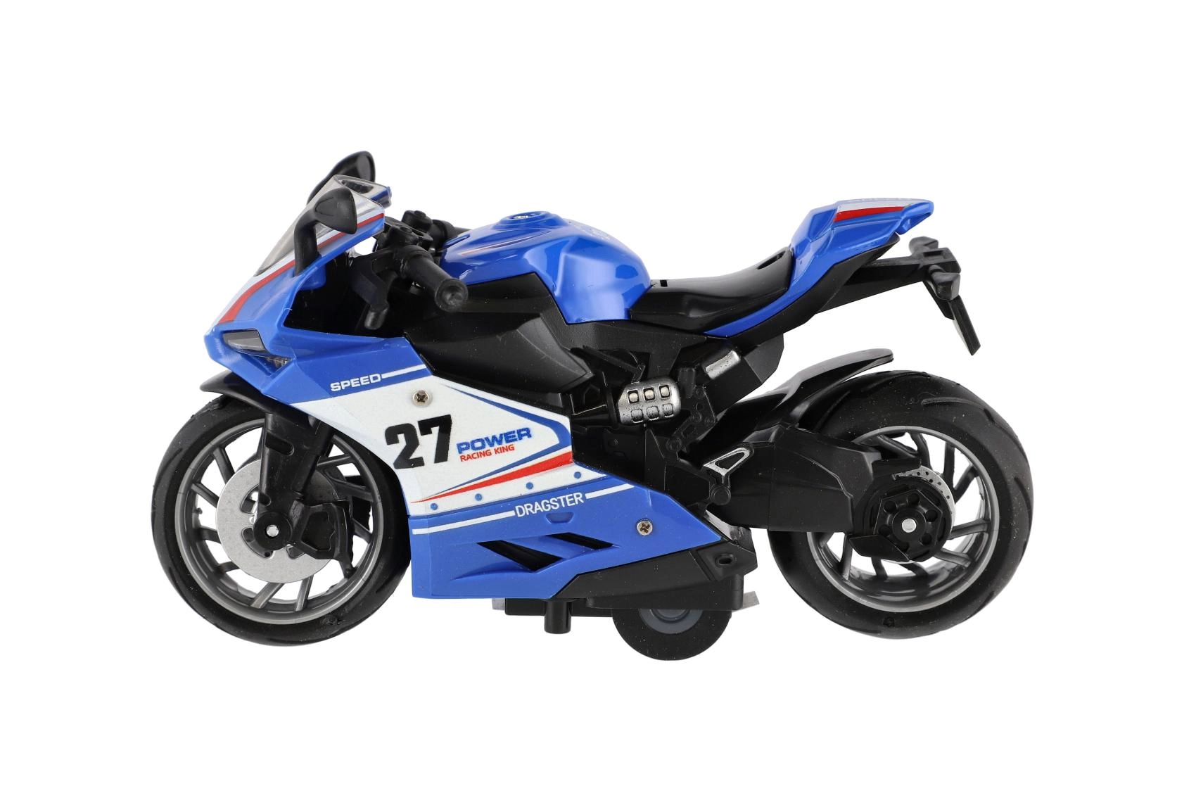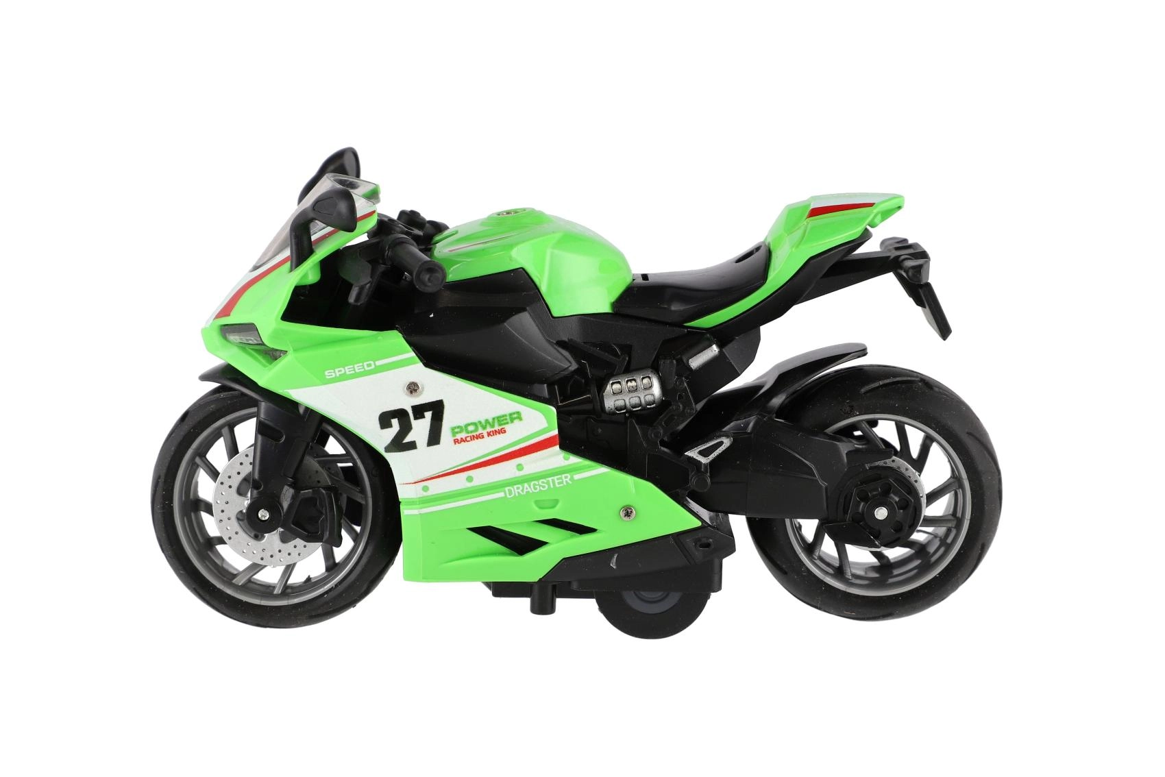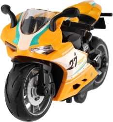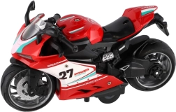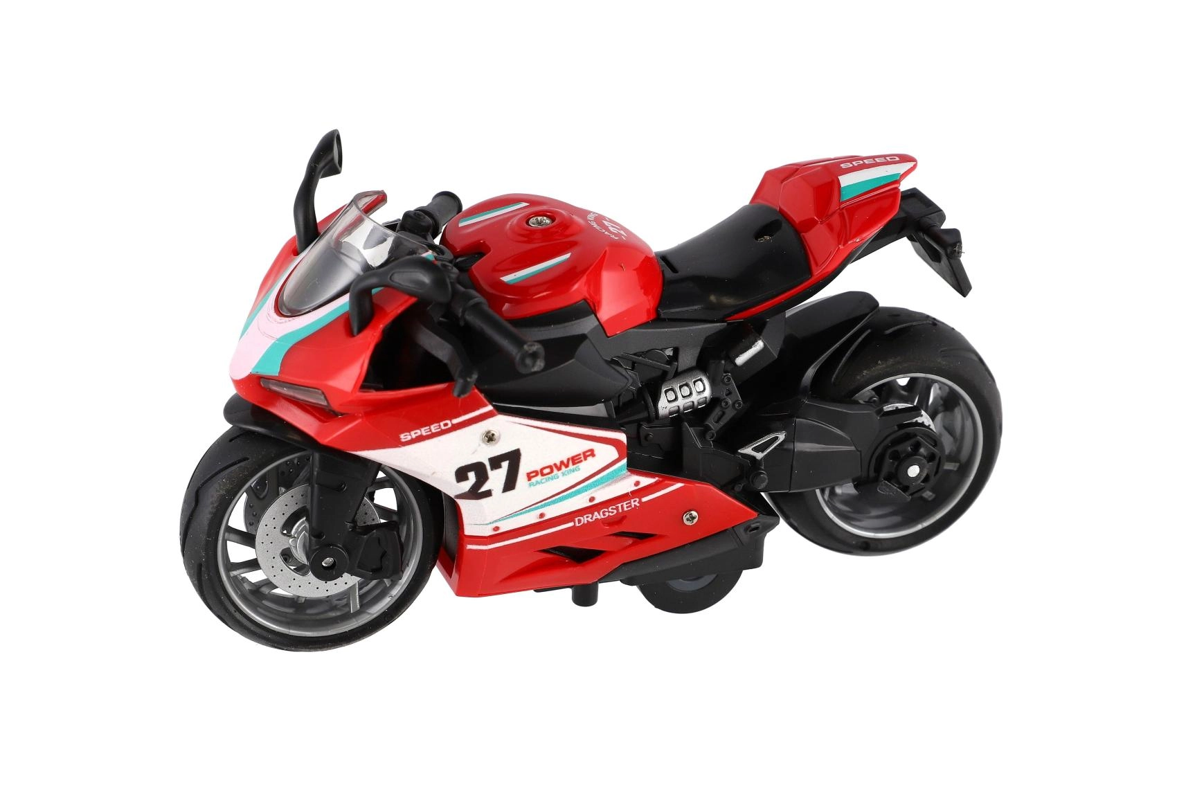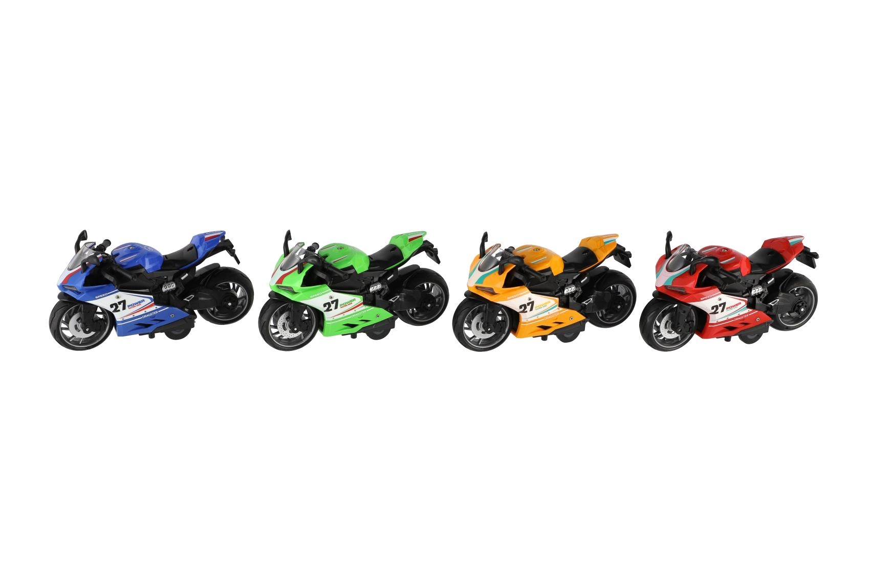 Mazs sacīkšu motocikls ar garumu 13 cm sniedz lielu devu izklaides. Pateicoties atpakaļvilkšanas funkcijai, tas strauji izšaujas uz priekšu pa gludu virsmu, bet gaismas efekti un motora skaņa pastiprina braukšanas reālistisko sajūtu. Ideāli piemērots mazajiem ātruma entuziastiem no 3 gadu vecuma.