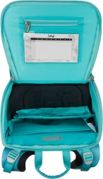 Atveres izklapināšanas sistēma ļauj viegli piekļūt piederumiem tieši no skolas sola. Iekšējā gumija palīdz noturēt somas saturu savā vietā.