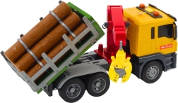 Reālistiska kravas automašīna ar celtni koka pārvadāšanai mērogā 1:14 iepriecinās mazos būvtehnikas fanus. Tā piedāvā funkcionālu celtni baļķu iekraušanai un izkraušanai, gaismas un skaņas efektus (signāls, braukšana atpakaļ, trauksme) un izturīgu izpildījumu no kvalitatīvas plastmasas. Bērni attīsta sīko motoriku, izprot tehnikas darbības principus un gūst stundām ilgu izklaidi.