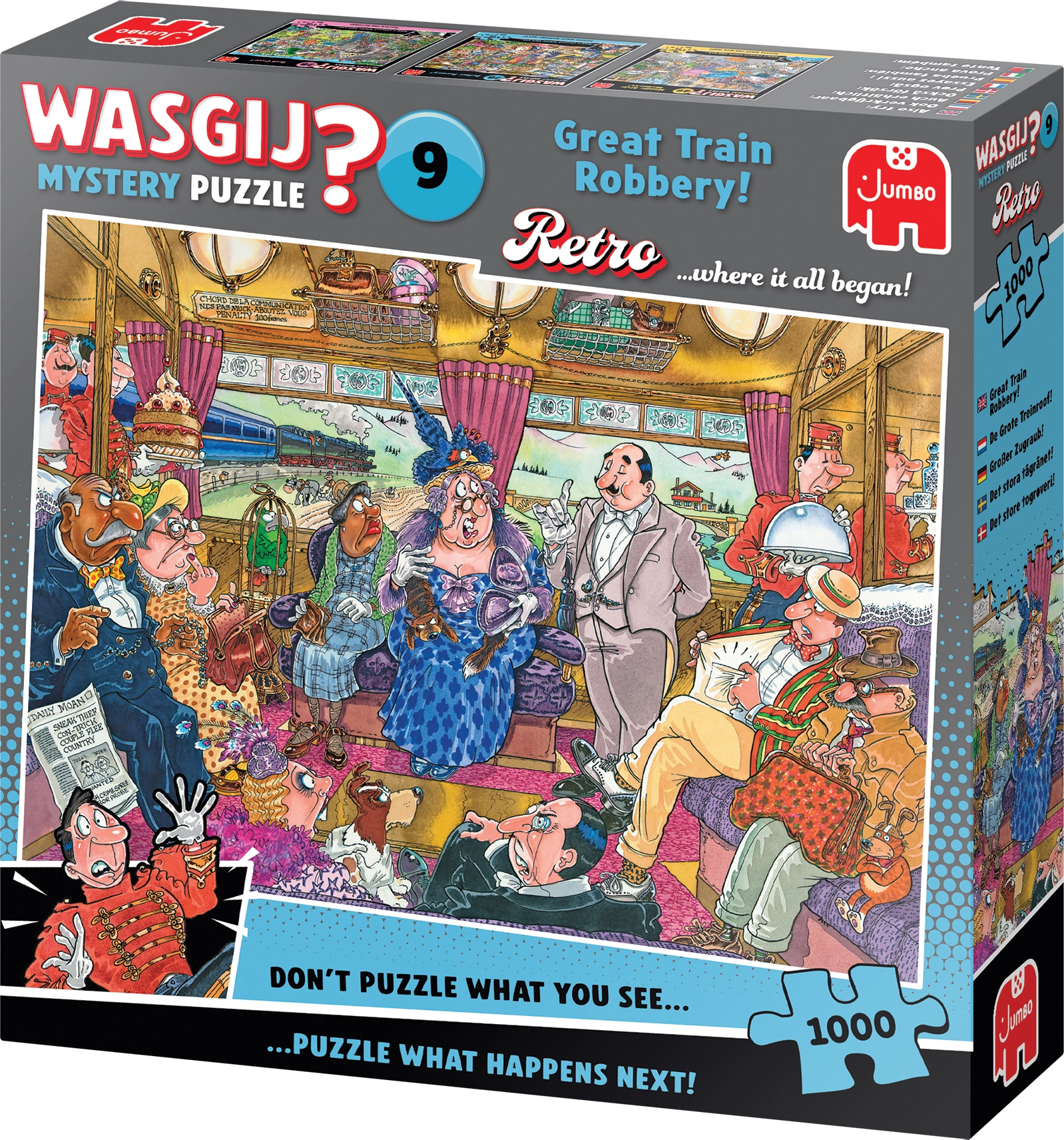 Atklājiet unikālās JUMBO WASGIJ puzles, kas apgriež salikšanu otrādi. Gala attēls nav identisks tam, kas redzams uz kastes – jūs saliekat ainu no cita skatpunkta. Jūs gaida gudra mīkla, oriģināla koncepcija un 1000 gabaliņu, kas pilni ar humoru, loģiku un spriedzi lielās vilciena laupīšanas stilā.
