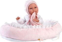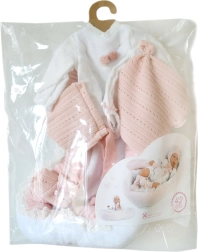 Apģērbs lellītei–zīdainim 40–42 cm ir daļa no 4 daļu komplekta, kas ietver trīs apģērba gabalus, dekoratīvu mīļmantiņu un ligzdiņu. Roku darbs Spānijā, paredzēts bērniem no 3 gadu vecuma.