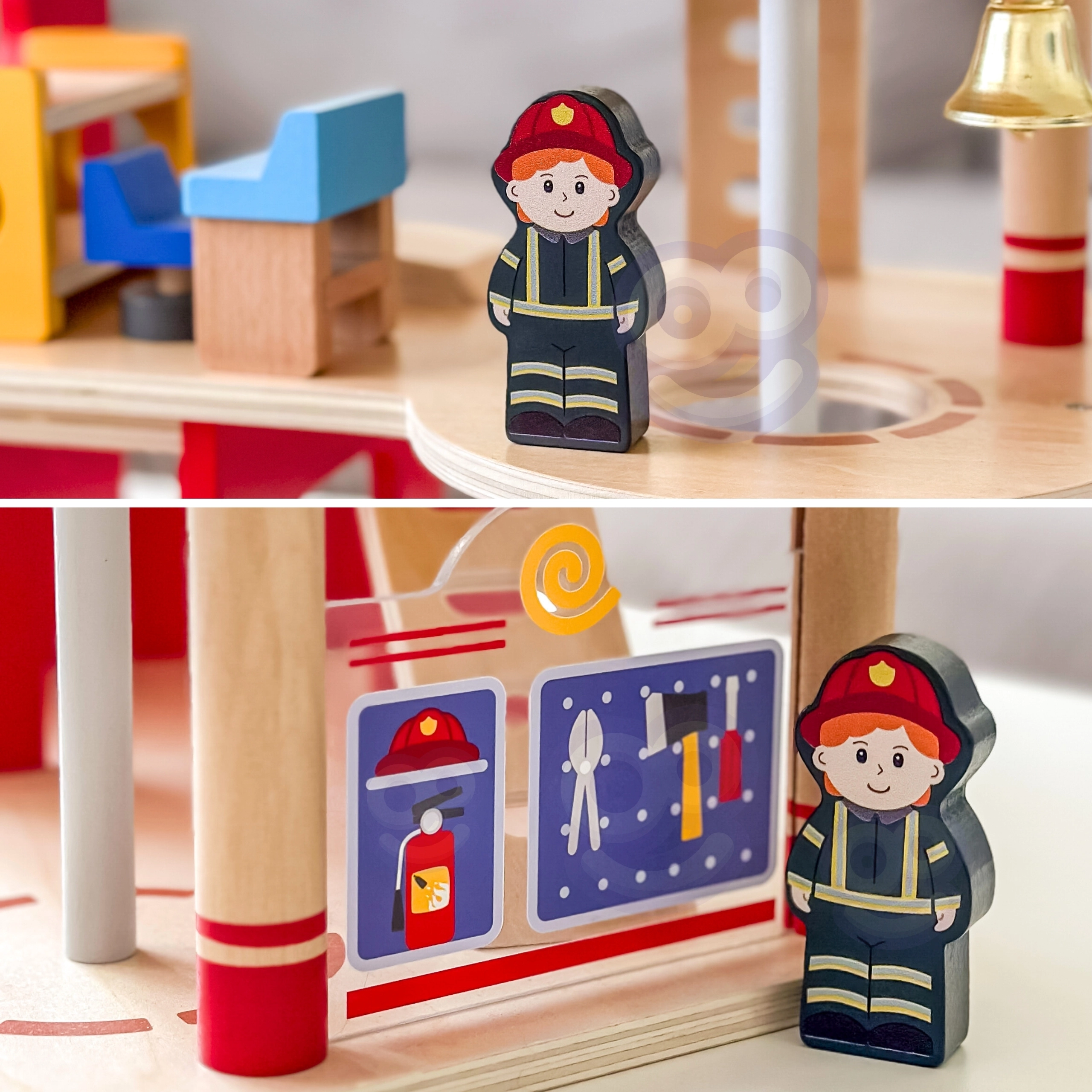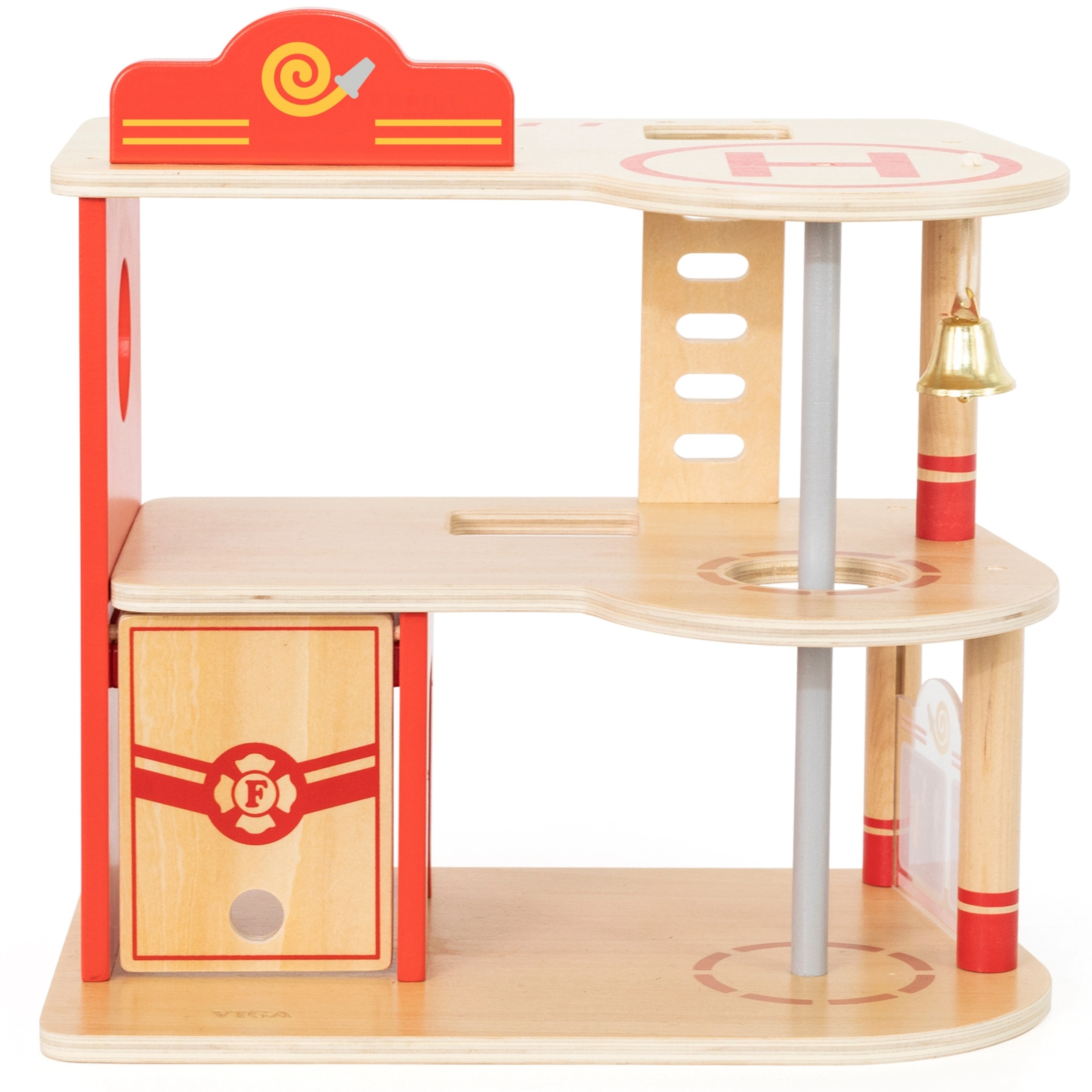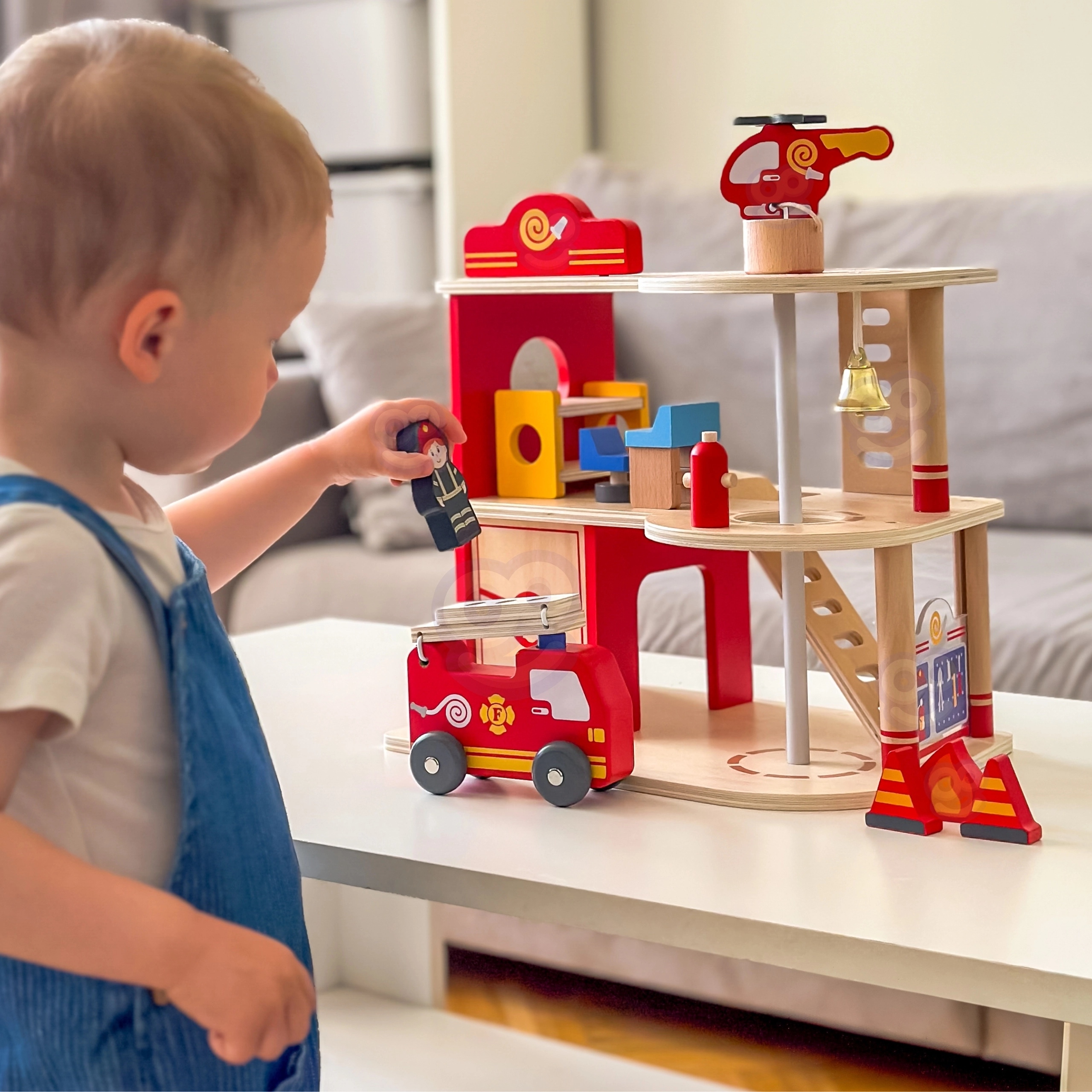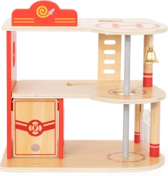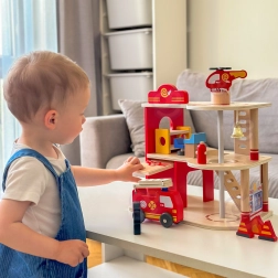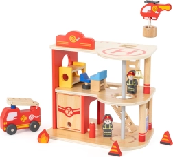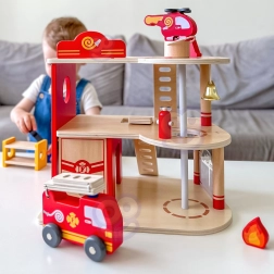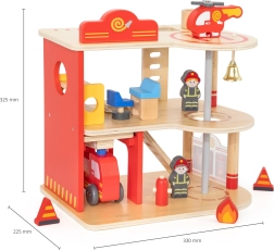 Šī robustā koka ugunsdzēsēju stacija ar trim līmeņiem sniedz bērniem no 3 gadu vecuma stundām ilgu aizraujošu izklaidi. Pirmajā stāvā ir garāža ugunsdzēsēju automašīnai un vieta aprīkojumam, otrajā stāvā mājīga atpūtas zona ar zvaniņu un stieni ātrai nolaidei, trešajā stāvā atrodas heliports ugunsdzēsēju helikopteram.