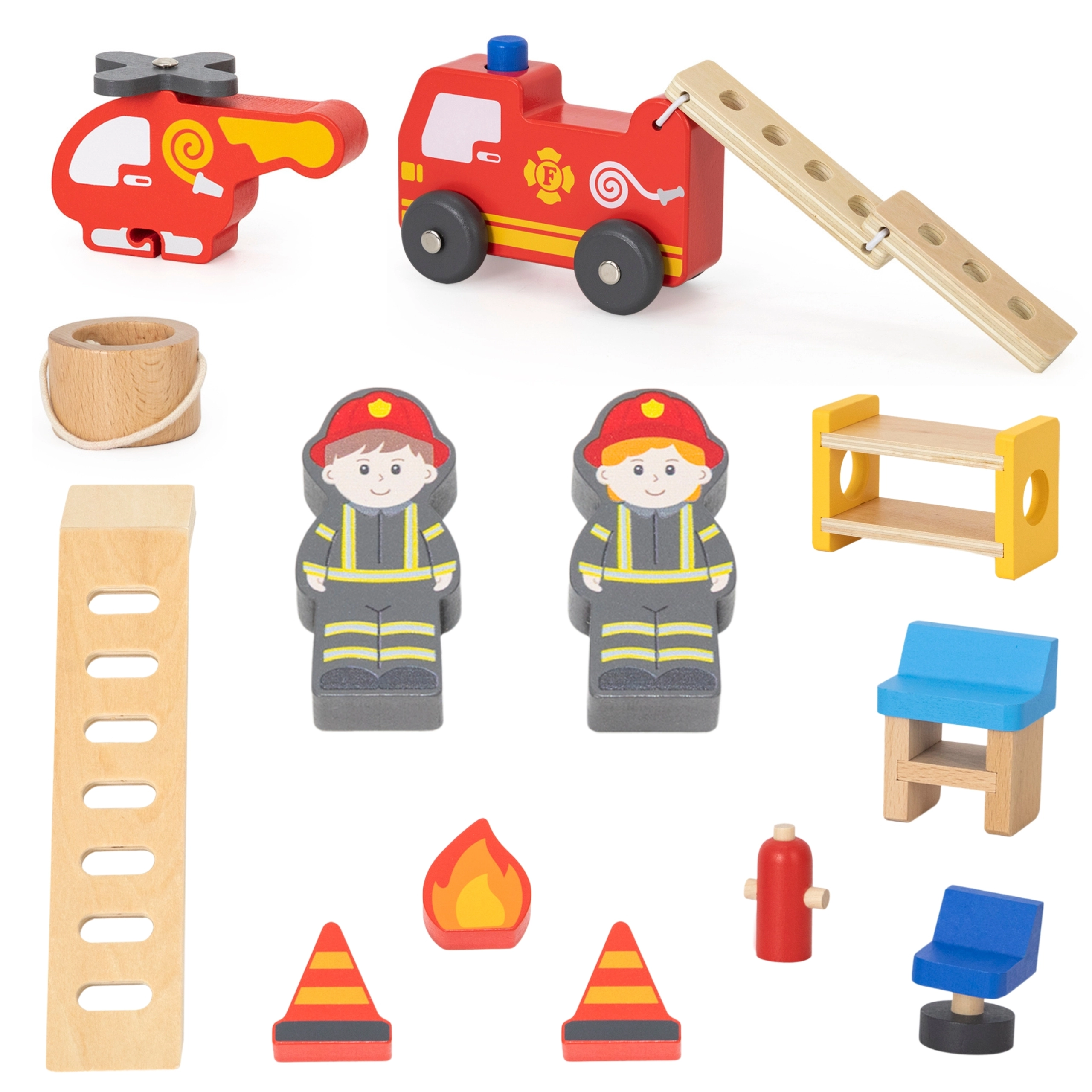 Iepakojumā atradīsiet visu, kas vajadzīgs aizraujošai spēlei: ugunsdzēsēju automašīnu, helikopteru ar ūdens tvertni, 2 ugunsdzēsēju figūriņas, liesmu “dzēšanai”, šķēršļu konusus, ugunsdzēšamo aparātu un mēbeles (gulta, galds, krēsls). Kvalitatīvs koks, gludas malas un spilgtas krāsas nodrošina drošu un ilgmūžīgu spēli.