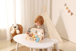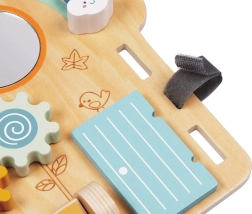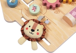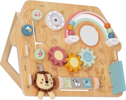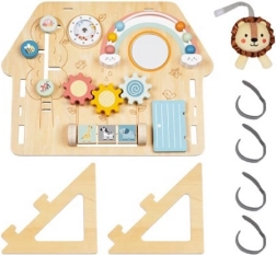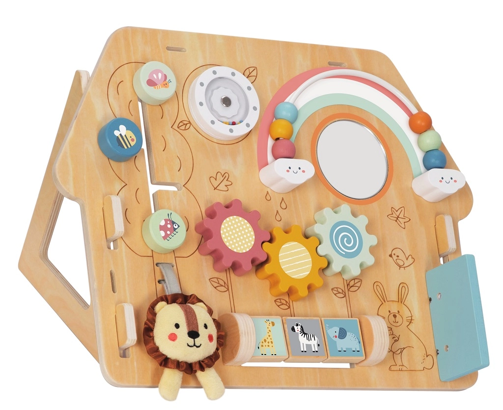 Mājiņas formas aktivitāšu dēlis ar lauvēna motīvu stimulē bērnu maņu uztveri, pateicoties maigām krāsām, mīlīgiem attēliem un dažādām virsmas tekstūrām. Bērniem patīk tādas aktivitātes kā krellīšu labirints, grozāmās un bīdāmās plāksnītes ar dzīvnieku attēliem. Šis spēļu dēlis veicina arī roku-acu koordināciju un iztēli.