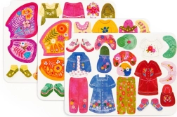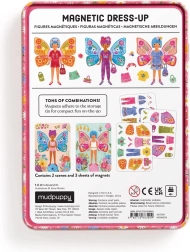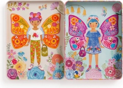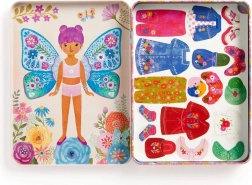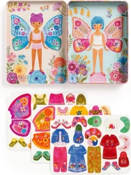 Komplektā ietilpst divas ilustrētas ainas ar tauriņu jaunkundzēm, kuras gaida, kad tās saģērbsiet. Izmēģiniet vairāk nekā 40 magnētus ar apģērbu un tauriņu spārniem uz trim kartītēm. Katru elementu var kombinēt atbilstoši jūsu pašu iztēlei.