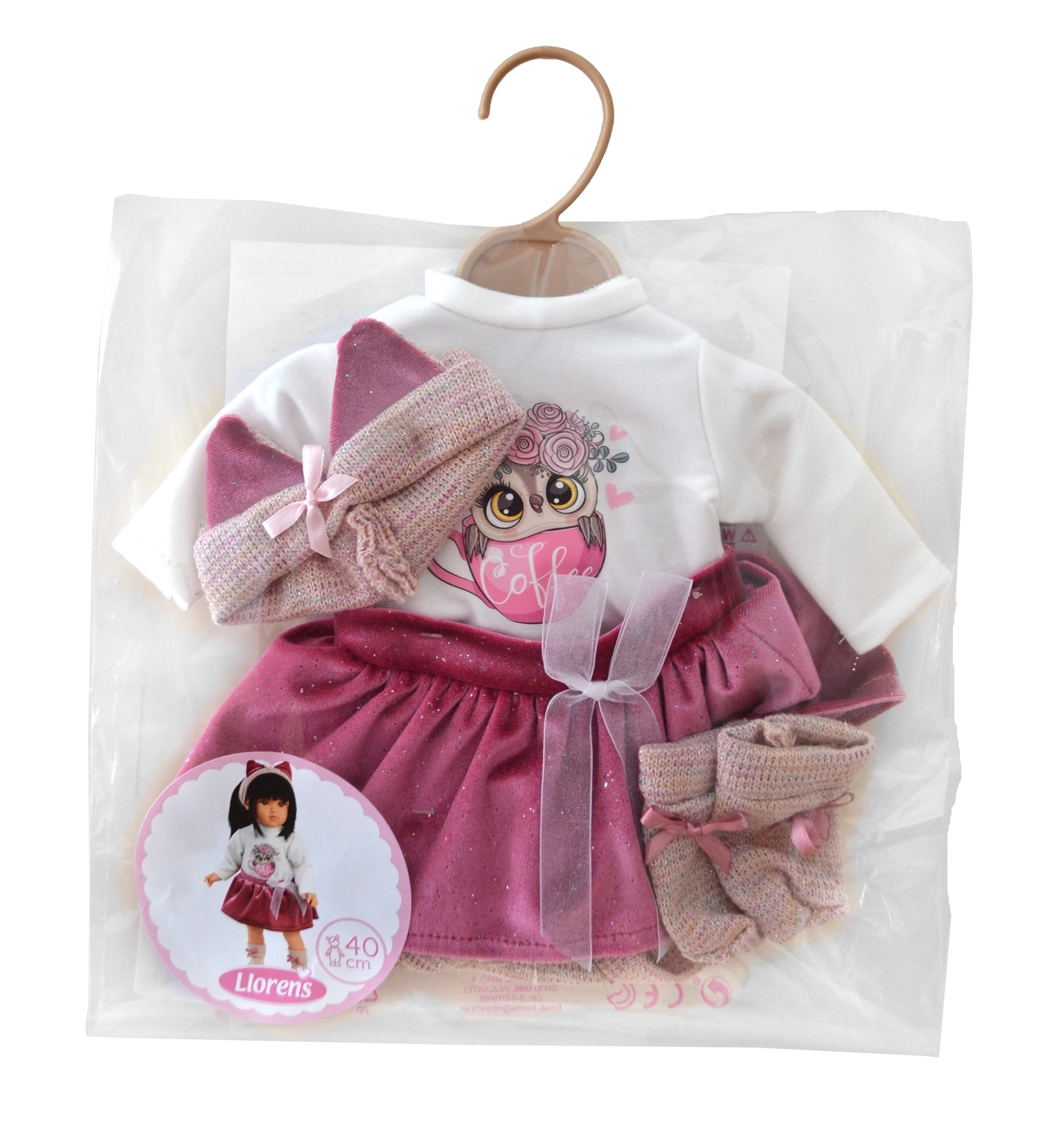 Šis kvalitatīvais apģērbu komplekts piešķirs jūsu lellei šarmu un ļaus bērniem attīstīt iztēli, pārģērbjot un izdomājot stāstus. Roku darbs no Spānijas garantē precīzu izpildījumu un patīkamus materiālus, kas ir piemēroti bērnu rokām.