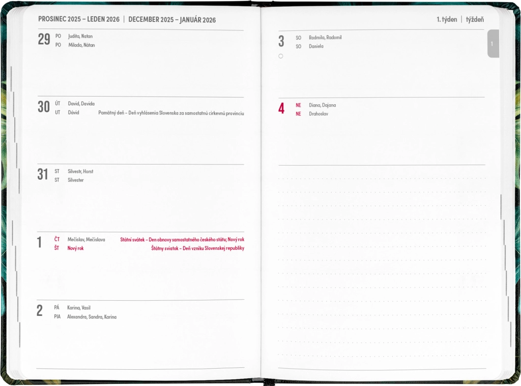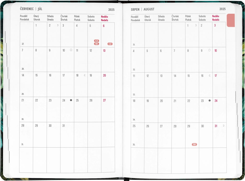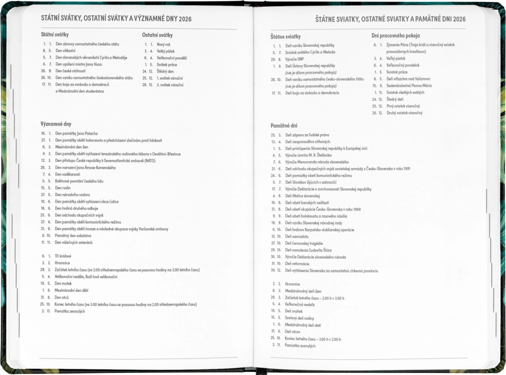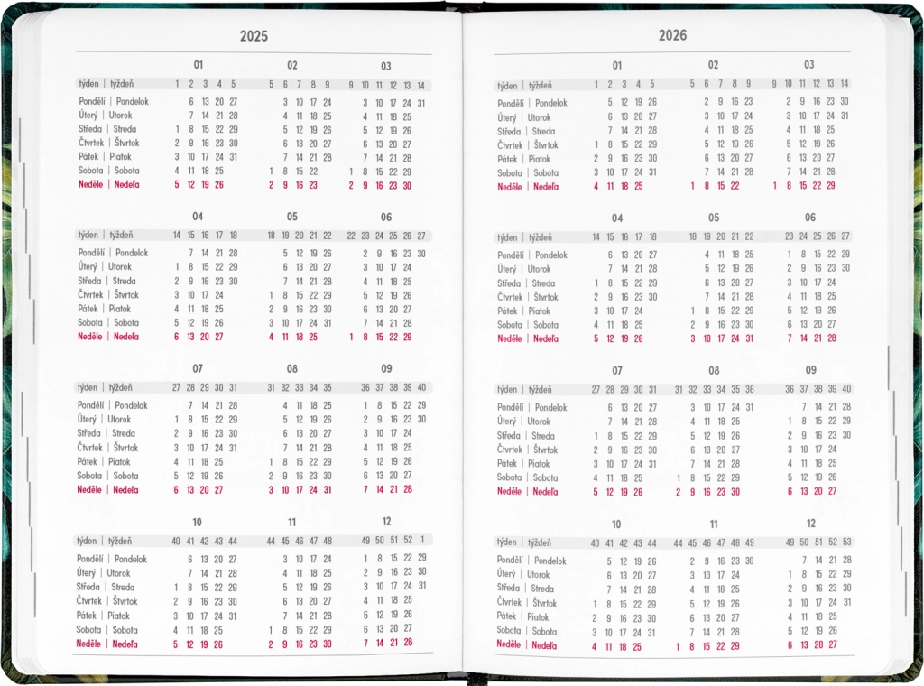 Petito Monstera kalendārs ir ideāls palīgs plānošanai no 2025. gada jūlija līdz 2026. gada decembrim. Pateicoties pārskatam par 2025. un 2026. gadu un kalendārijam ar vārdiem un svētkiem ne tikai čehu, bet arī slovāku valodā, jums vienmēr būs viss svarīgais pa rokai. Praktiskais izkārtojums nodrošina ērtu orientēšanos, bet vieta piezīmēm sniedz telpu svarīgu uzdevumu un domu pierakstīšanai. Kalendāram ir elegants dizains ar Monstera motīvu, kas iepriecinās ikvienu stilīgu kancelejas piederumu cienītāju.