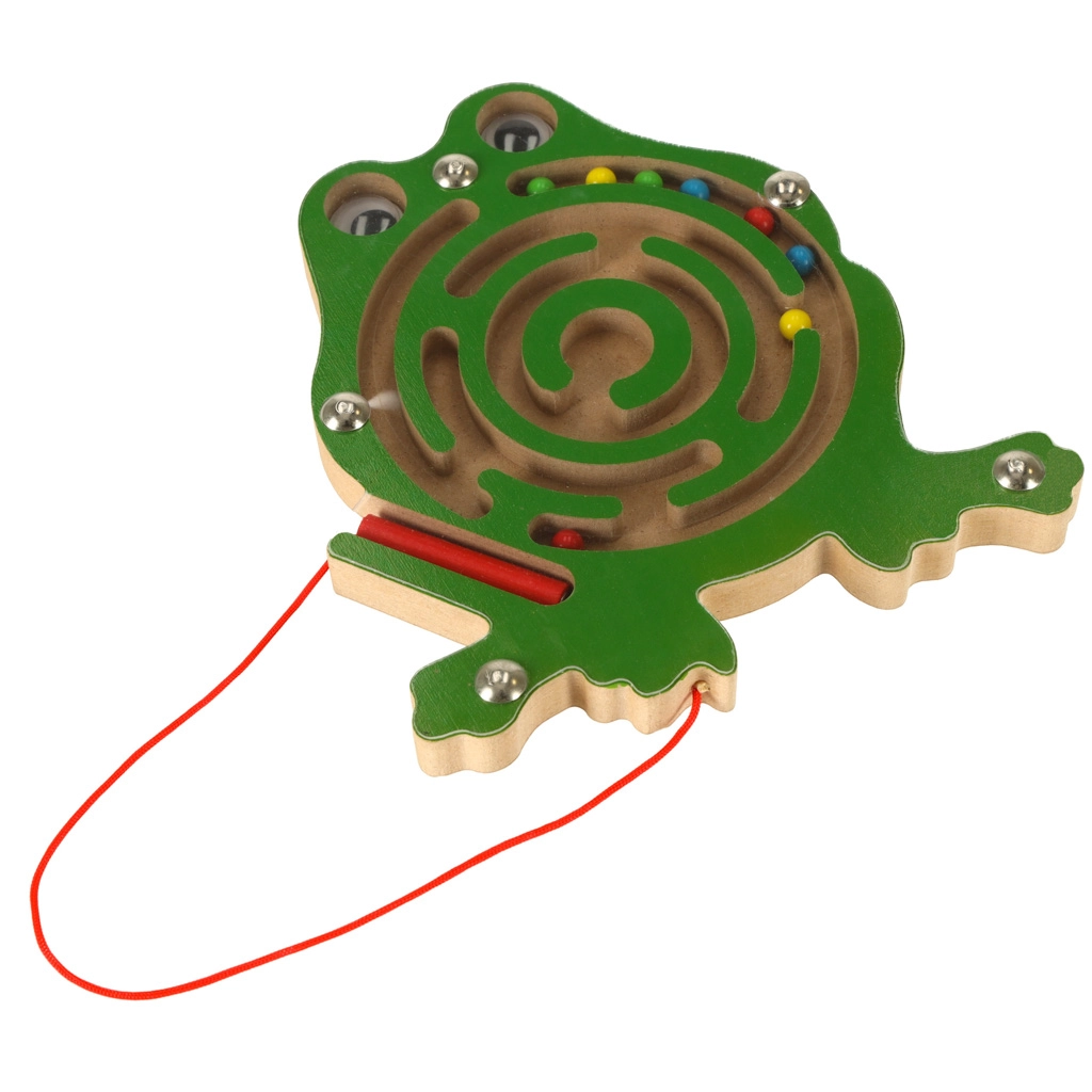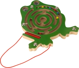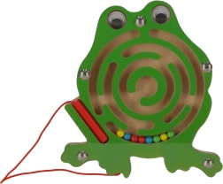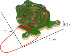 Šis koka magnētiskais labirints vardītes formā izklaidēs bērnus ilgi gan mājās, gan ceļā. Komplektā esošā magnētiskā pildspalva ar aukliņu palīdz vadīt krāsainās lodītes pa līkumotajiem celiņiem līdz mērķim. Caurspīdīgs vāks nodrošina, ka lodītes vienmēr paliek rotaļlietas iekšpusē.