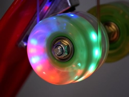 Riteņi no izturīga materiāla ar gumijas pārklājumu nodrošina lielisku saķeri un vibrāciju slāpēšanu. Iebūvētās LED diodes, kas iedegas braukšanas laikā, piešķir skrituļdēlim unikālu izskatu un uzlabo lietotāja redzamību – bez baterijām! Diodes tiek darbinātas ar magnētisko enerģiju, ko ģenerē riteņu griešanās.
