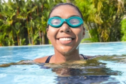 Izturīgas polikarbonāta lēcas ar UV filtru pasargā acis no kaitīgā saules starojuma pie āra baseina vai jūrā.
