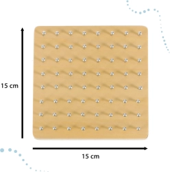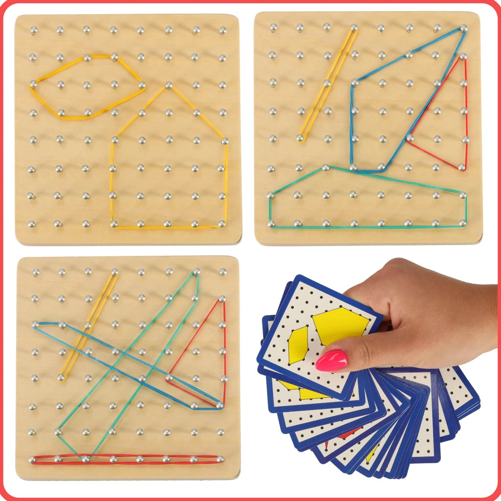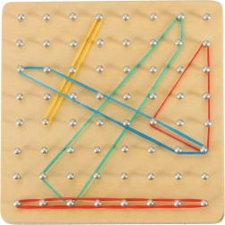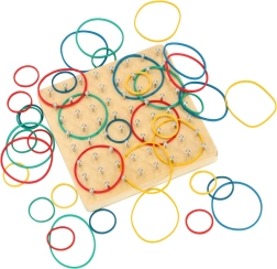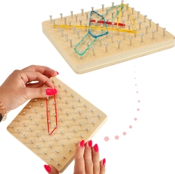 Atklājiet jautru veidu, kā bērnus iepazīstināt ar matemātikas pamatiem – formām, leņķiem un simetriju. Uz koka plāksnes ar blīvu tapiņu režģi bērni stiepj dažāda garuma un krāsu gumijas un veido attēlus pēc kartītēm vai pēc savas fantāzijas. Spēle attīsta acu–roku koordināciju, koncentrēšanos un loģisko domāšanu.