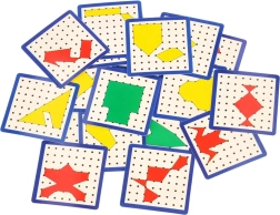 Divpusējās kartītes ar dažādas grūtības pakāpes paraugiem māca bērniem atpazīt formas, krāsas, simetriju un leņķus. Atliek tikai uzvilkt pareizās gumijas un nokopēt paraugu.