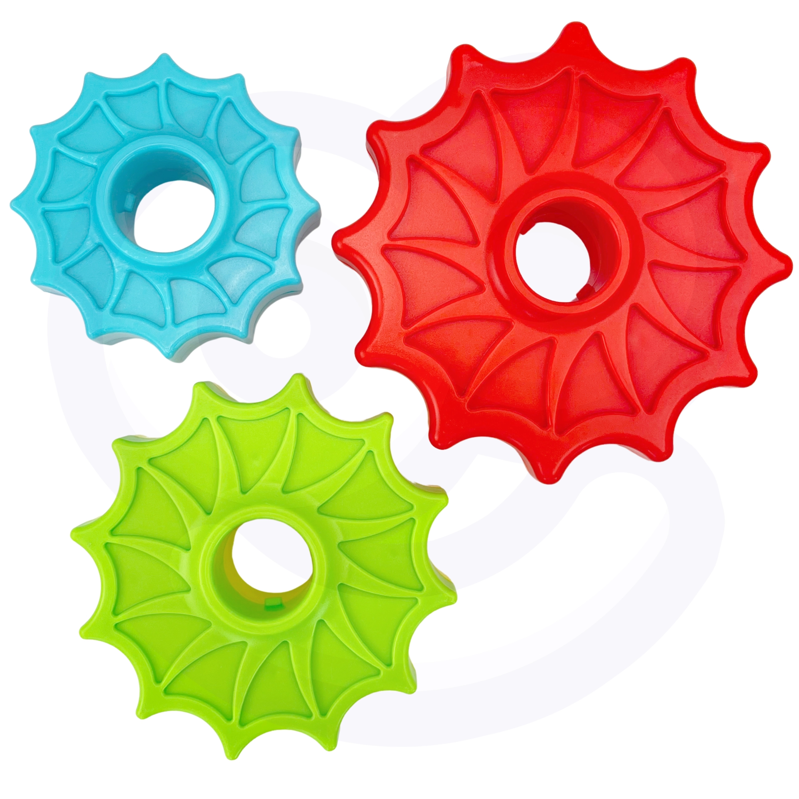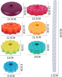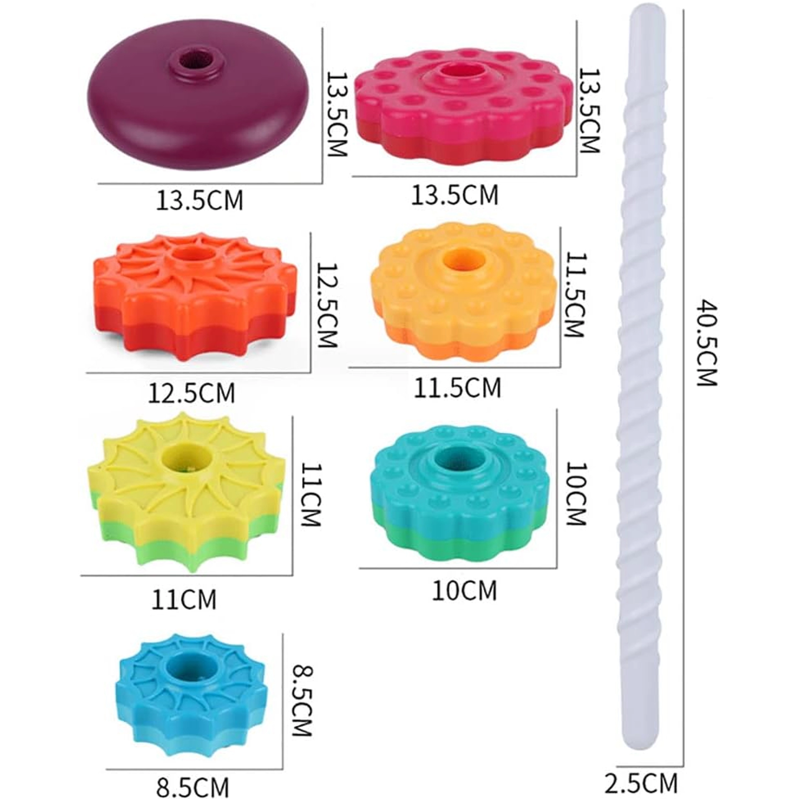 - Komplektā ietilpst seši zvaigžņveida diski, kurus var salikt kopā un veidot krāsainu un rotējošu piramīdu