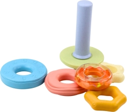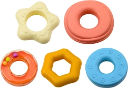 Katram riņķim ir atšķirīga tekstūra, un viens no tiem ir aprīkots ar grabulīti. Tādējādi rotaļlieta piedāvā dažādus skaņas un sensoros stimulus, kas veicina uztveres un koncentrēšanās spēju attīstību. Visas detaļas ir izgatavotas no drošiem, izturīgiem materiāliem bez kaitīgām vielām, kas ir pilnībā piemēroti pašiem mazākajiem lietotājiem.