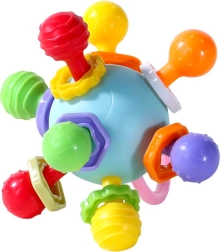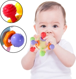 Iebūvētais grabulītis viegli skan kustības laikā, veicinot dzirdes attīstību un piesaistot bērna uzmanību. Kompaktais izmērs un rokturi, kas pielāgoti mazām rociņām, ļauj viegli satvert, grozīt un spiest, tādējādi trenējot koordināciju un satvēriena spēku.