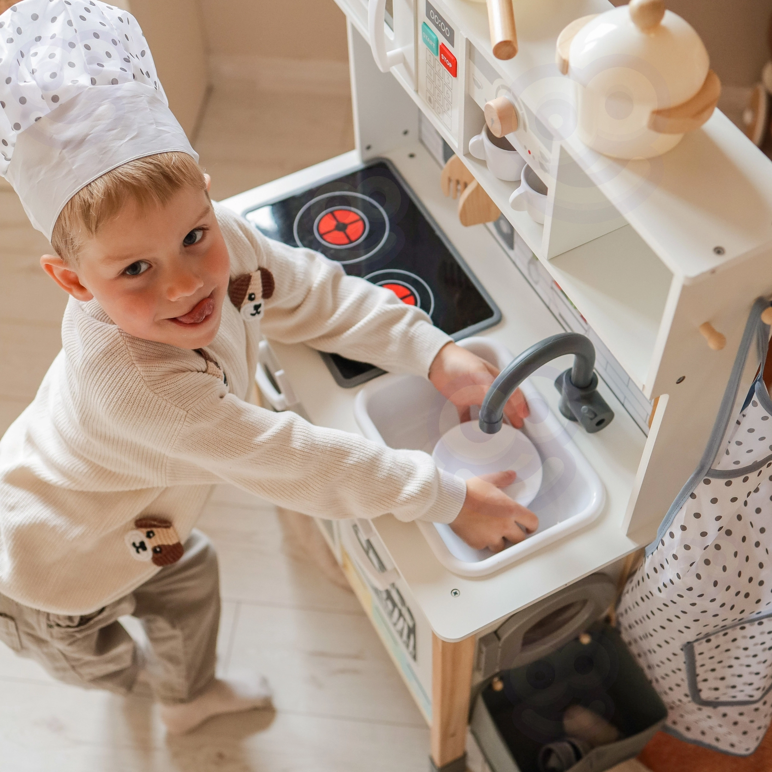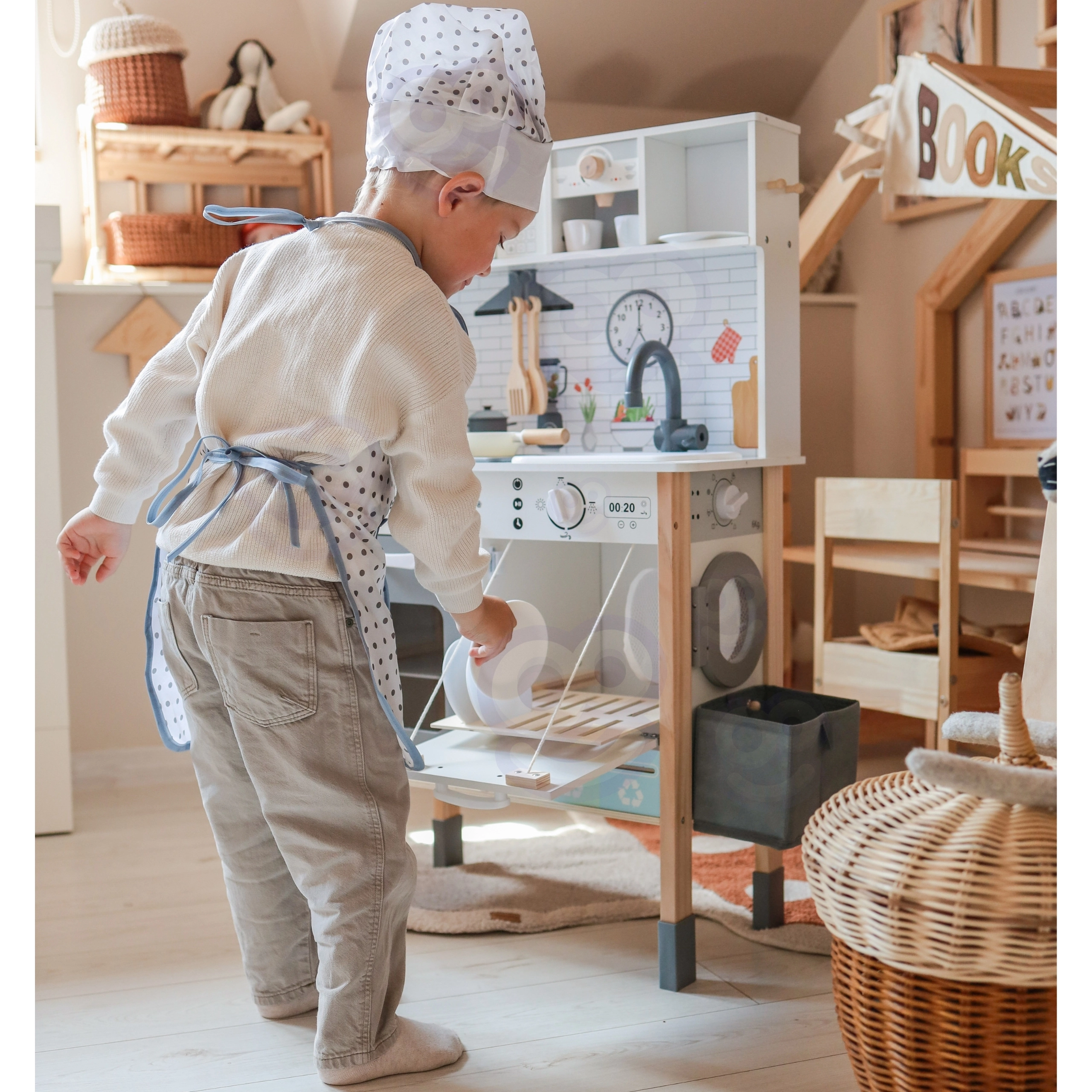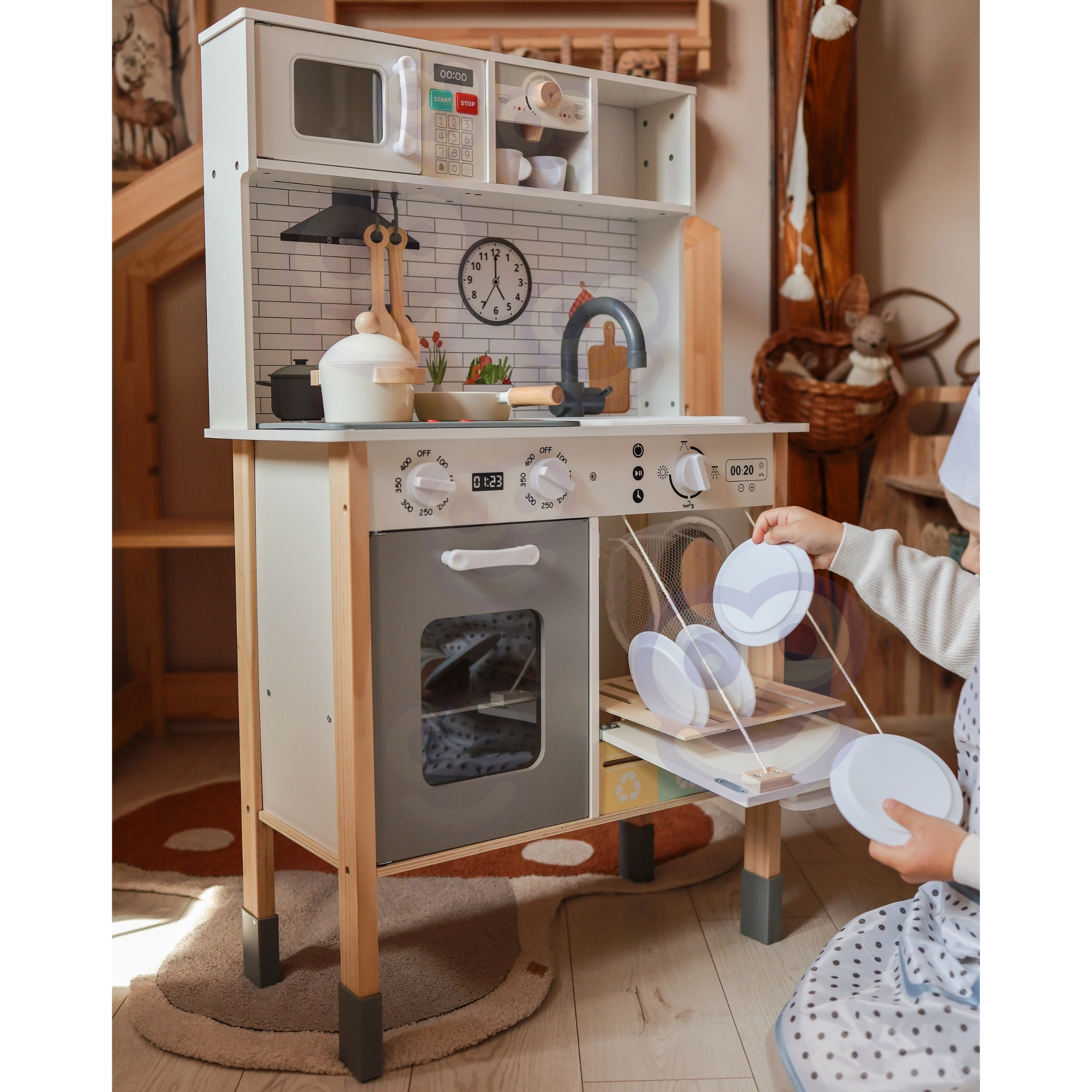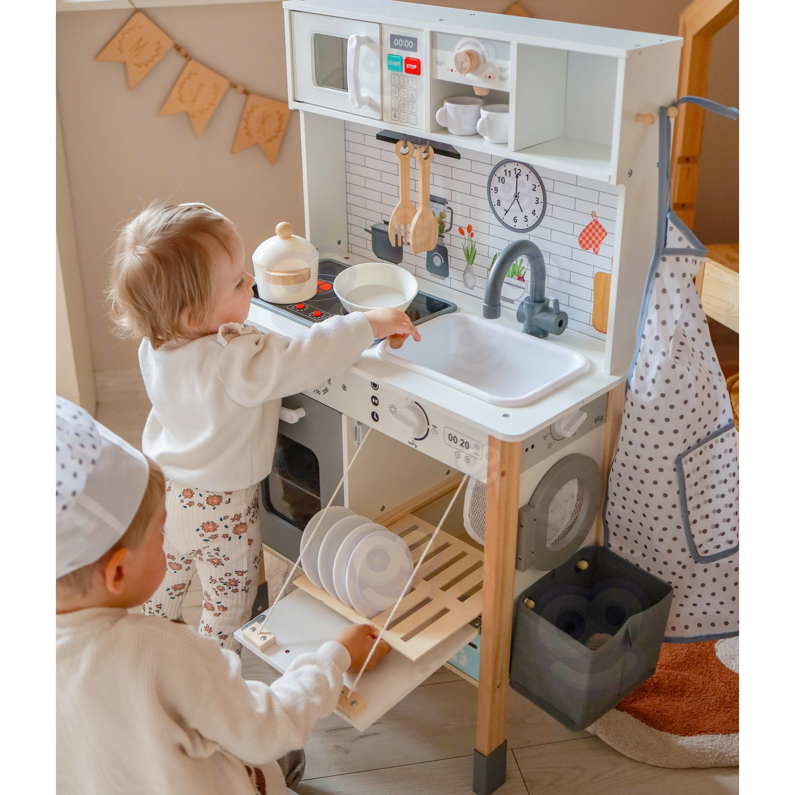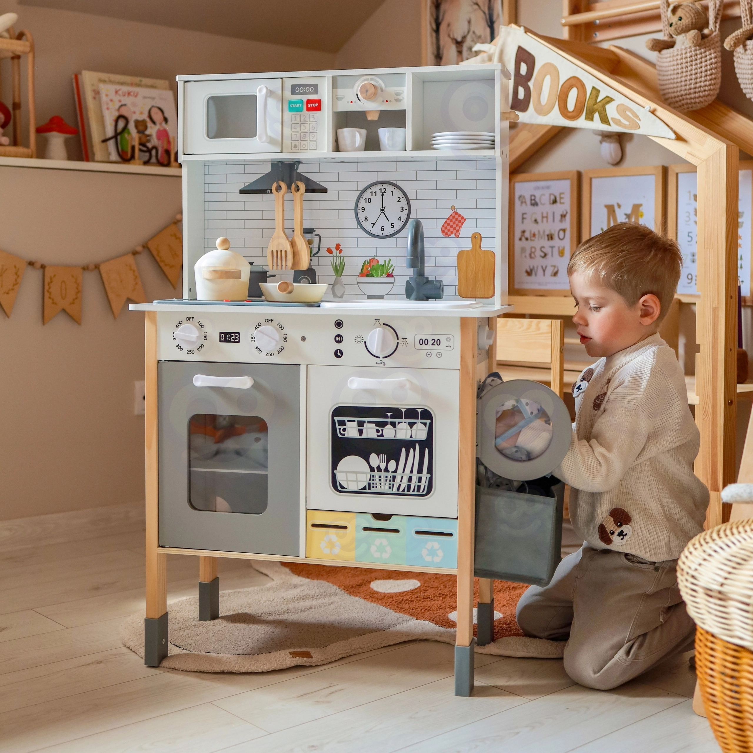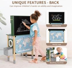 - 9‑in‑1 rotaļu centrs: gatavošana, cepšana, mazgāšana, veļas mazgāšana, zīmēšana, mācīšanās un atkritumu šķirošana.