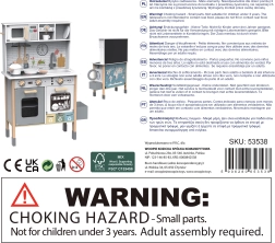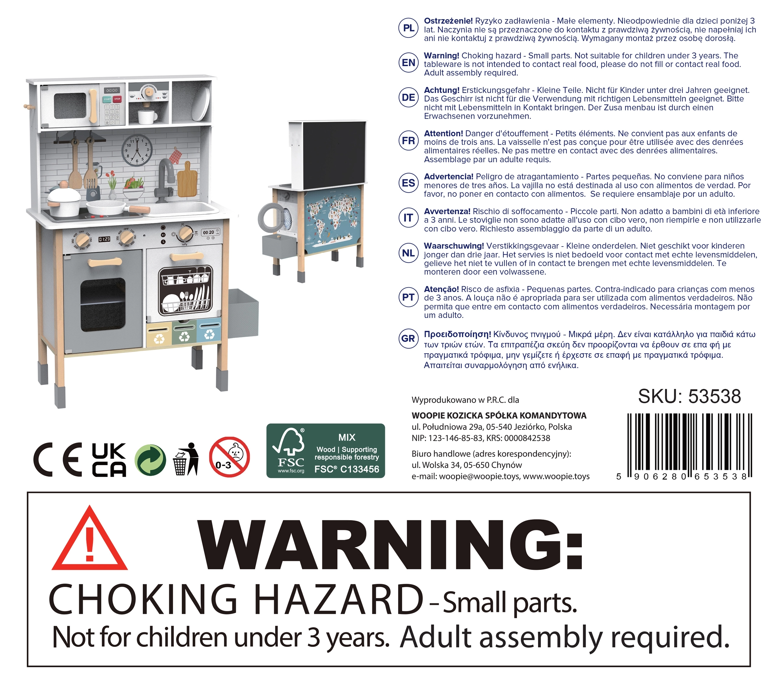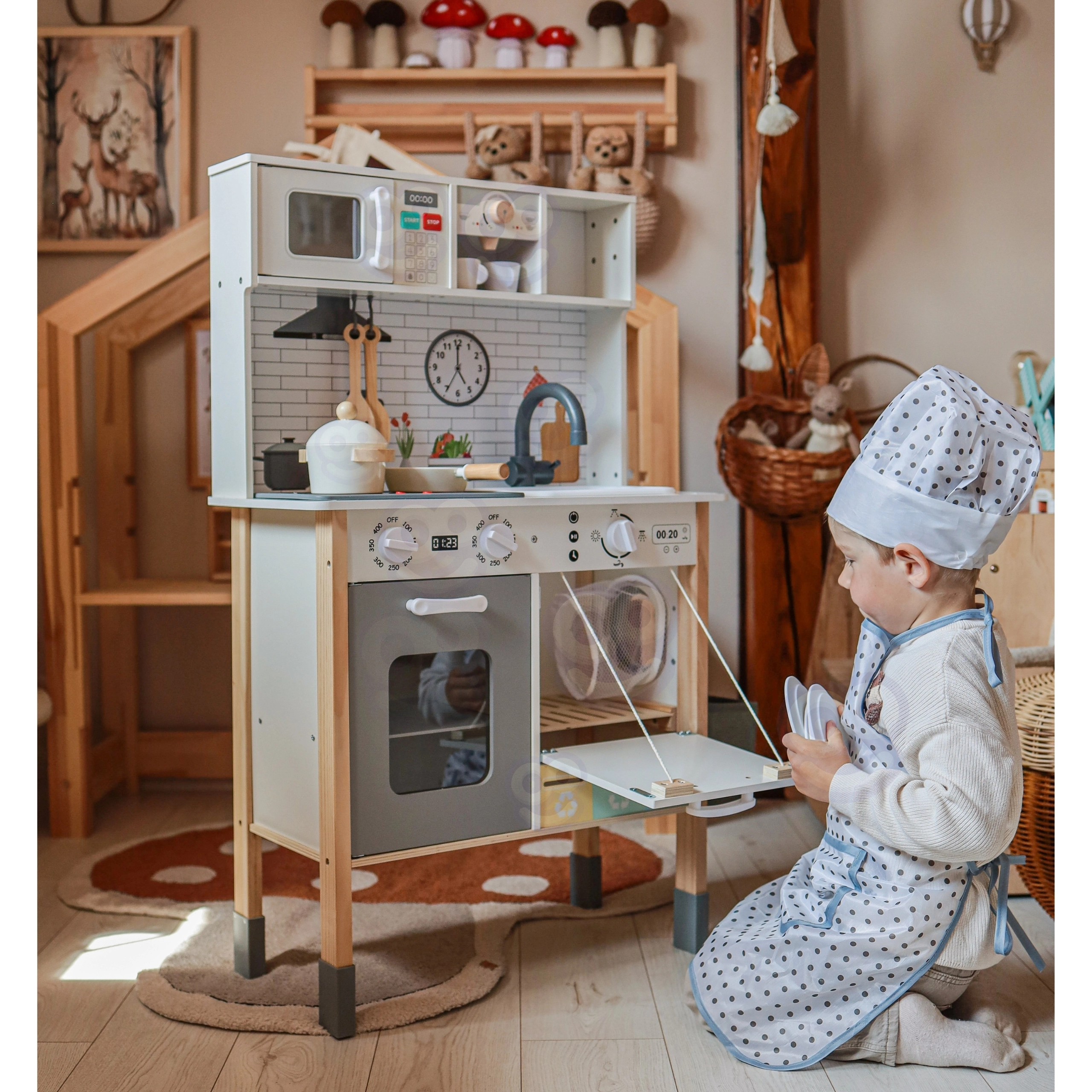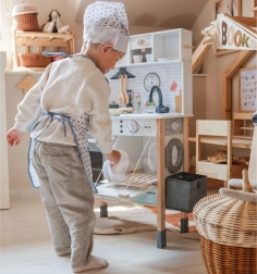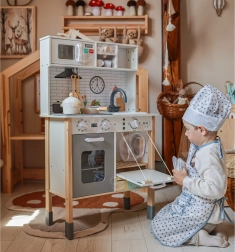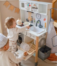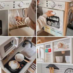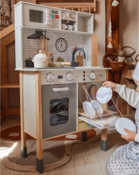 Šī koka virtuvīte WOOPIE GREEN ir izstrādāta mazajiem pavāriem un atklājējiem. Priekšējā daļa piedāvā bagātīgi aprīkotu kulinārijas zonu ar kafijas automātu, mikroviļņu krāsni, izlietni, krāsni, trauku mazgājamo mašīnu un indukcijas plīti ar gaismām un skaņām. Sānos ir praktiska veļasmašīna ar veļas grozu, kas rotaļīgā veidā māca ikdienas ieradumus. Aizmugurē atrodas krīta tāfele un krāsaina pasaules karte zīmēšanai, kontinentu iepazīšanai un iztēles attīstīšanai.