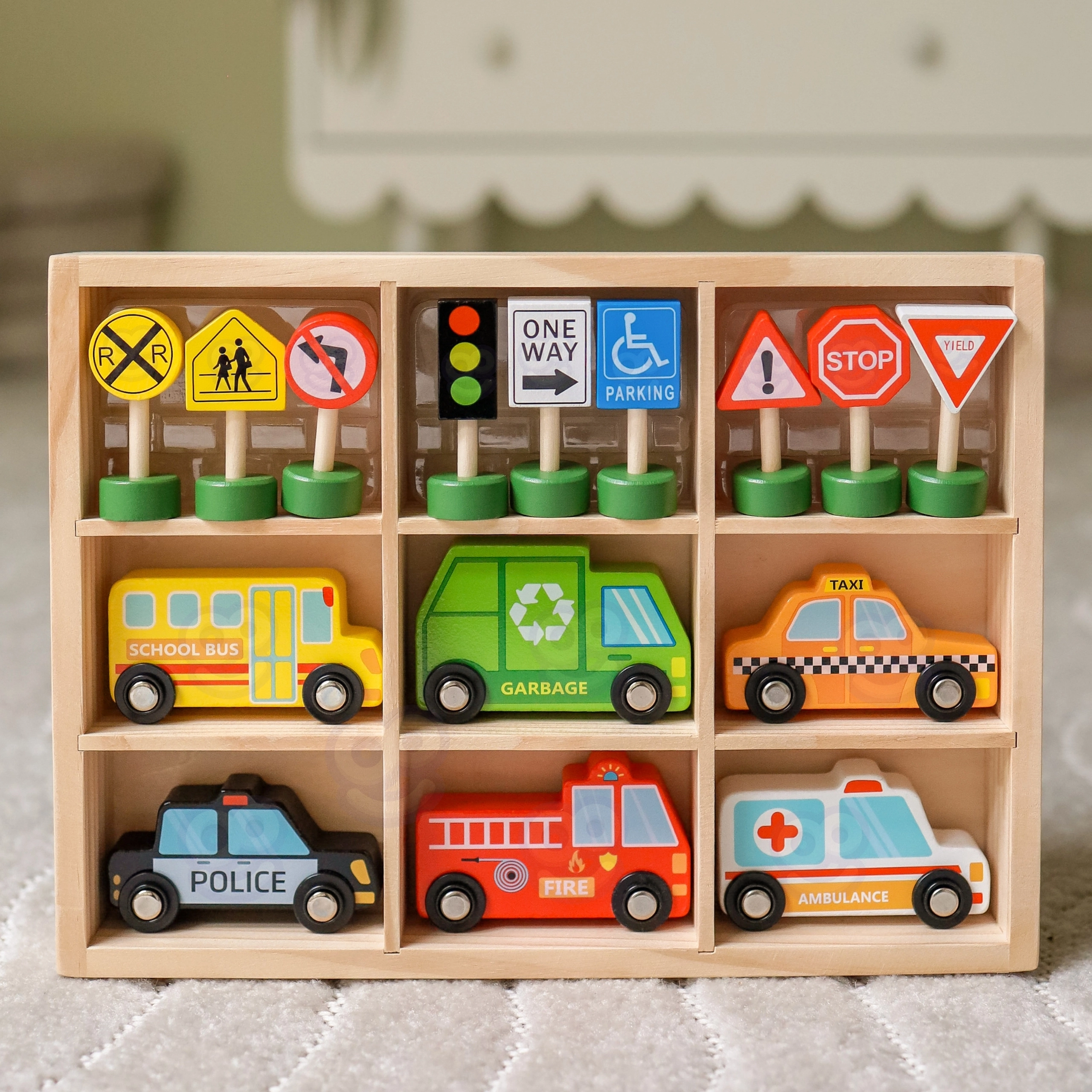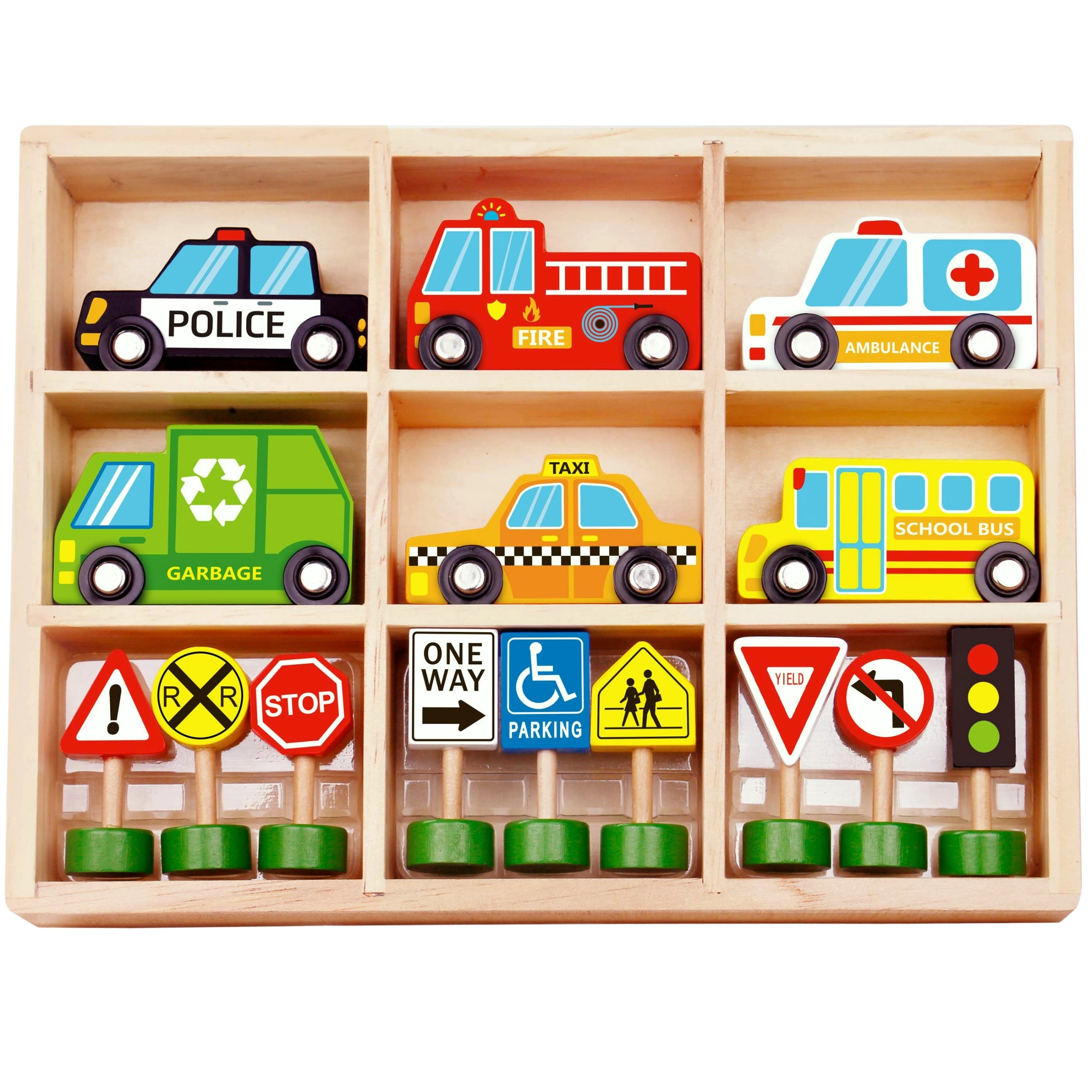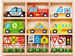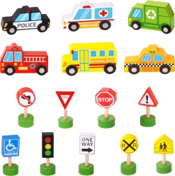 Komplektā ir 6 transportlīdzekļi, luksofors un 8 zīmes, kas palīdz bērniem dabiski apgūt pamatnoteikumus ceļu satiksmē.