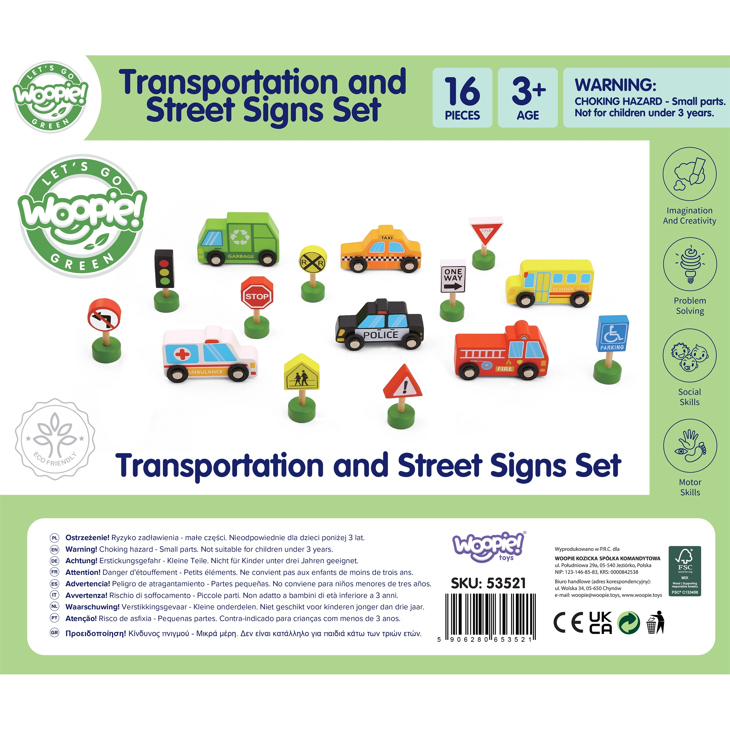 Atklājiet jautru un izglītojošu spēli bērniem no 3 gadu vecuma: koka transportlīdzekļu un ceļa zīmju komplektu no Woopie Green. Komplektā atradīsiet 6 krāsainus transportlīdzekļus un 9 ceļa zīmes, tostarp luksoforu, kas rotaļīgā veidā palīdz apgūt ceļu satiksmes noteikumus. Viss izgatavots no kvalitatīva koka un krāsots ar drošām, netoksiskām krāsām, ar noapaļotām malām maksimālai drošībai.