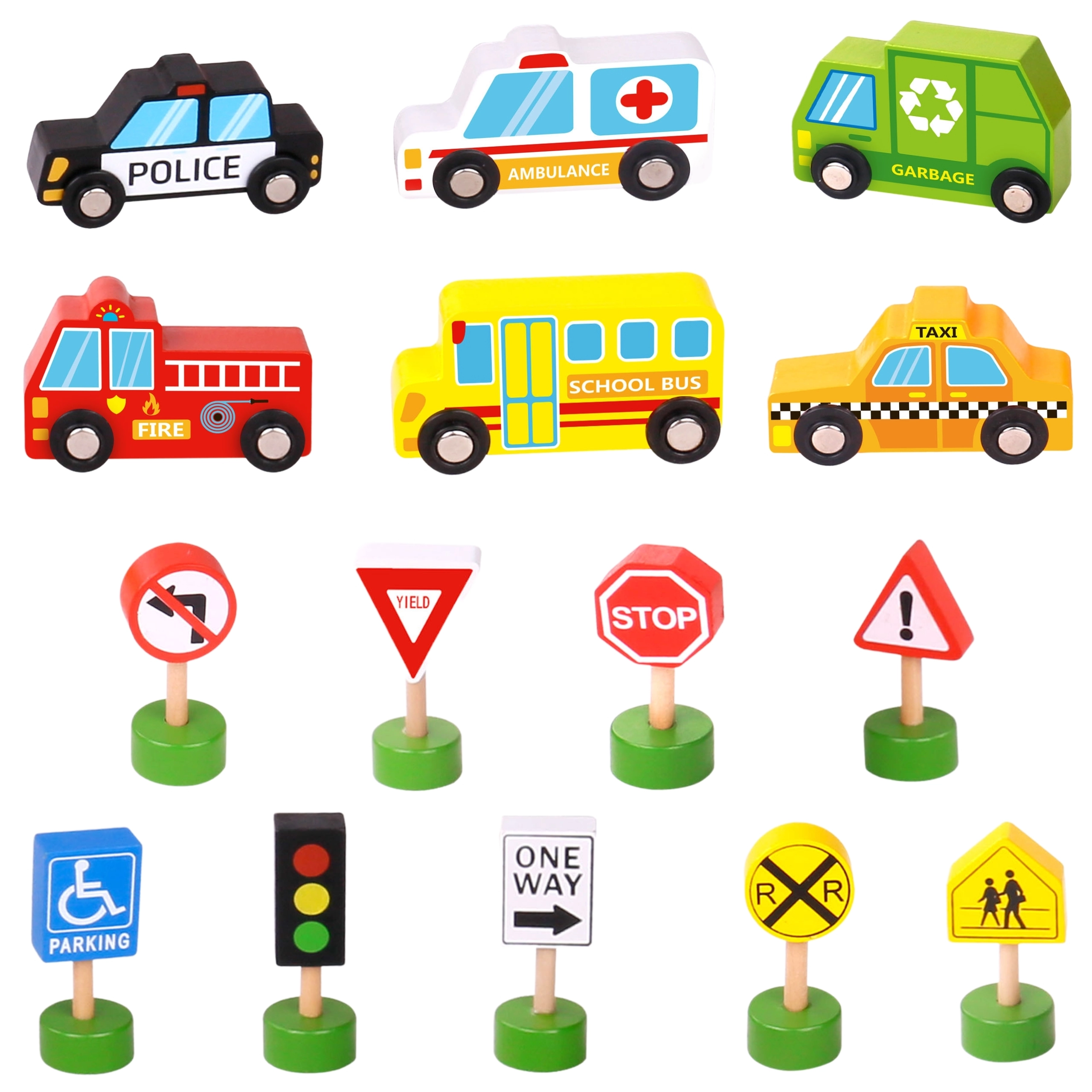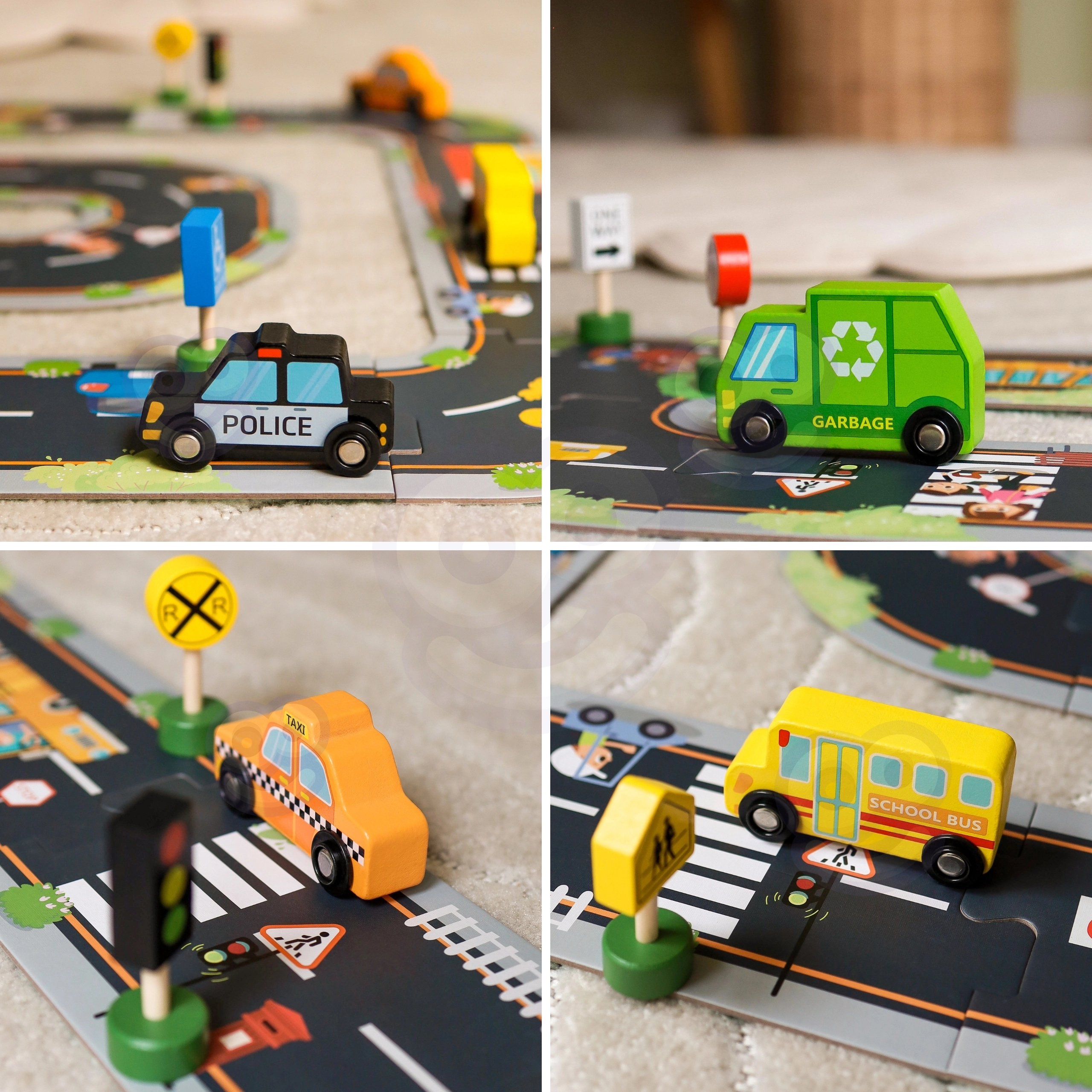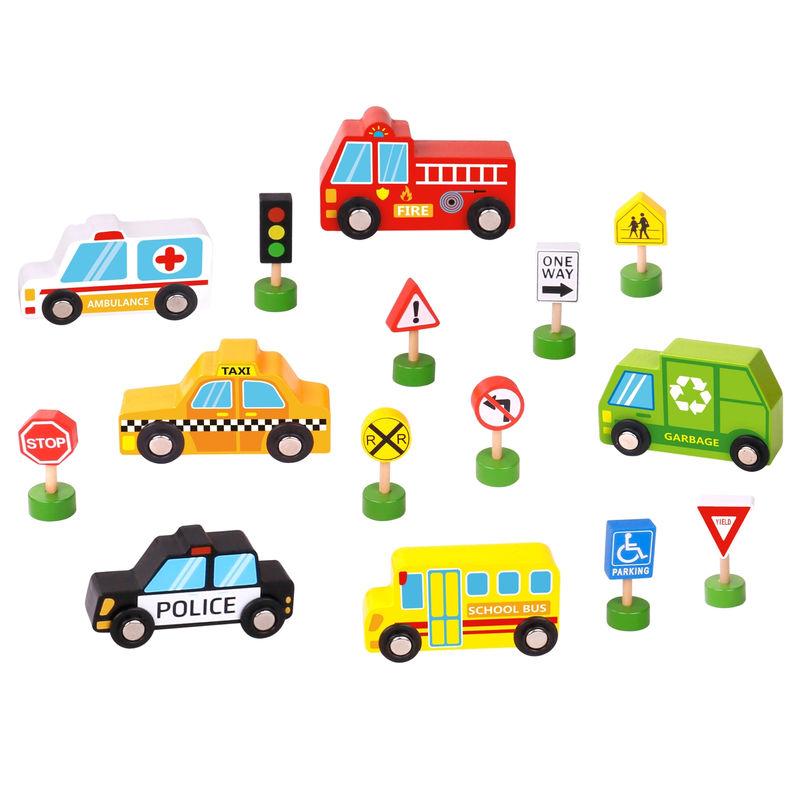 - Komplekta saturs: ātrā palīdzība, ugunsdzēsēju auto, taksometrs, skolas autobuss, policijas auto, atkritumu vedējs, luksofors un 8 ceļa zīmes.