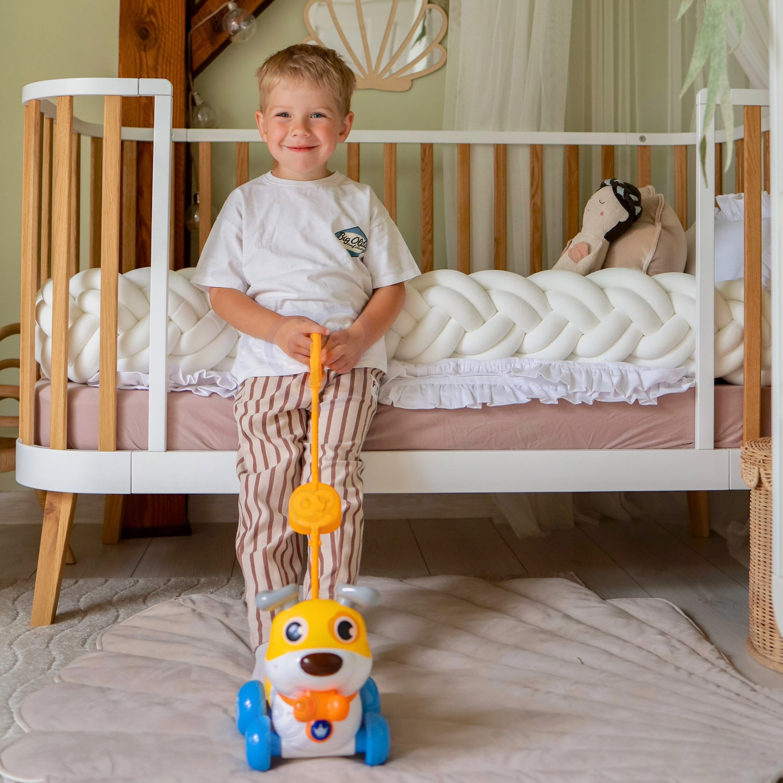 Mīlīgais interaktīvais sunītis no zīmola WOOPIE ir lielisks draugs pirmajiem soļiem un ikdienas rotaļām. Pateicoties funkcijai 2in1 – stumjamais un velkamais, tas viegli pielāgojas bērna tempam, vienlaikus rej un izdod jautras skaņas. Elastīgais rokturis nodrošina plūdenu kustību visos virzienos, bet rotējošās austiņas un aste 360° veicina zinātkāri un koordināciju. Komplektā ir arī mīlīga kociņa “barošanai”, kas attīsta iztēli un lomu spēles.
