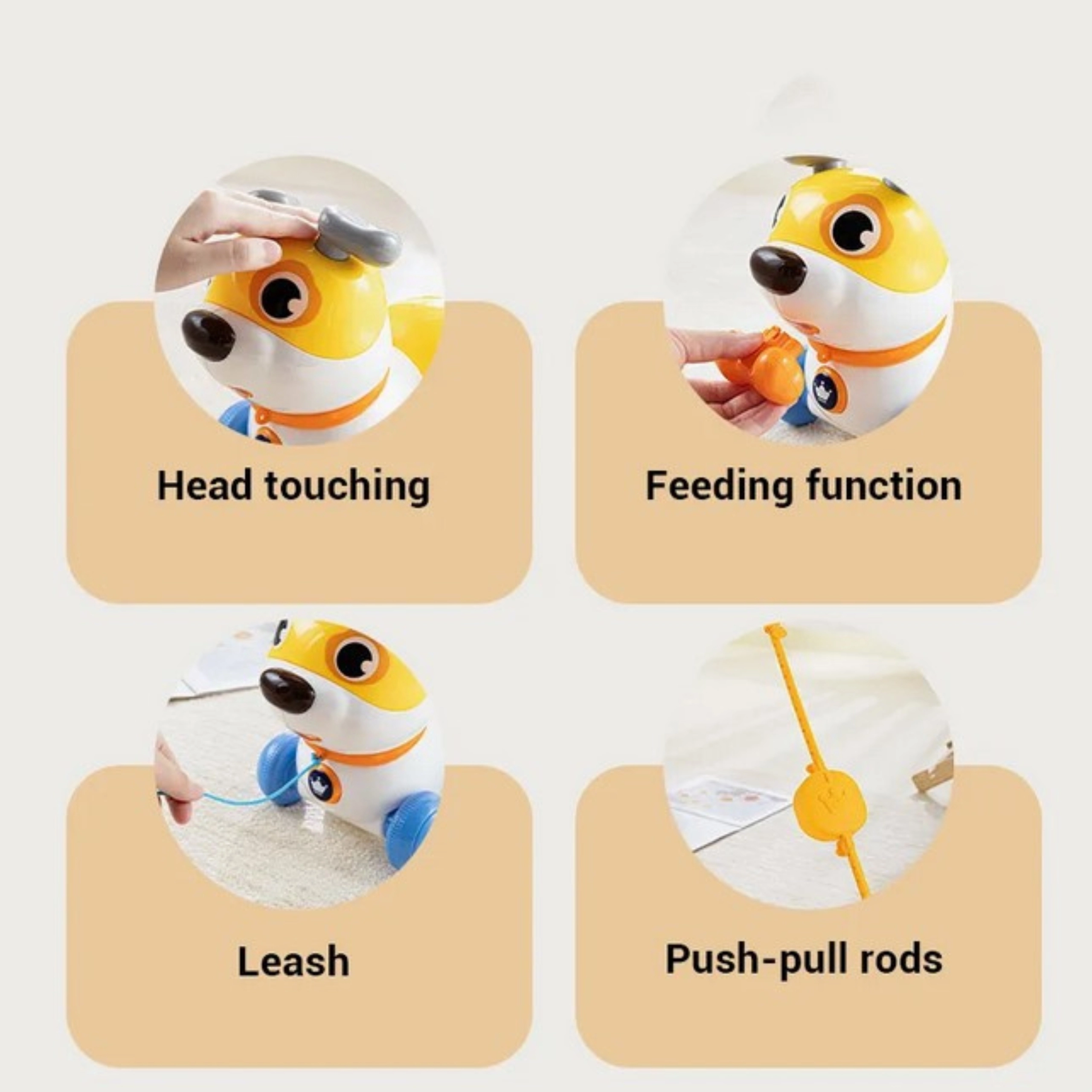 Sunītis rej un izdod realistiskas skaņas, reaģē uz pieskārieniem un pēc “pabarotšanas” ar pievienoto kociņu rāda savu prieku. Rotējošās austiņas un aste 360° palielina sensorisko stimulāciju, kamēr elastīgais rokturis nodrošina plūdenu pārvietošanos pa grīdu bez aizķeršanās – gan mājās, gan uz paklāja.